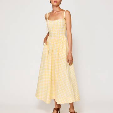 V-neck sleeveless mini dress with soft flared hem and allover gingham check for a casual, country-chic silhouette. 60% Cotton, 40% Polyester Model is 5'8" tall and wearing size Small