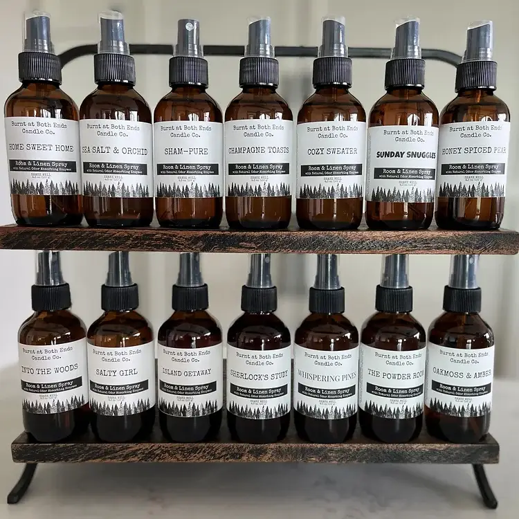 All our fragrances are phthalate free. 4 oz spray bottle, made with water and fragrance oils . Available in the following fragrances: -Asian Plum -Aqua Spa -cucumber melon -fresh linen -green tea -calming waters - rose -coconut - freesia -love - blend of essential oils and fragrance oils (A lush summer floral with delicate touches of musk and lime). -cherry almond -beach house (An exotic journey with lime, eucalyptus and coconut.) -mango berry tea -blue agave sugar - highlands (for men) - fireside (for men) - sandalwood musk (for men) -Strawberry Peach Champagne, -Oceanside, -Mango Coconut, -Coastal Water -Palo Santo -Oakmoss and Amber Custom labels I only print in black ink, so the logo has to be simple, in black, on a white background. The labels are required to carry either your address or the manufacturer's (us). ***We reserve the right to decline designing and printing labels with logos or messages that go against our faith and values.