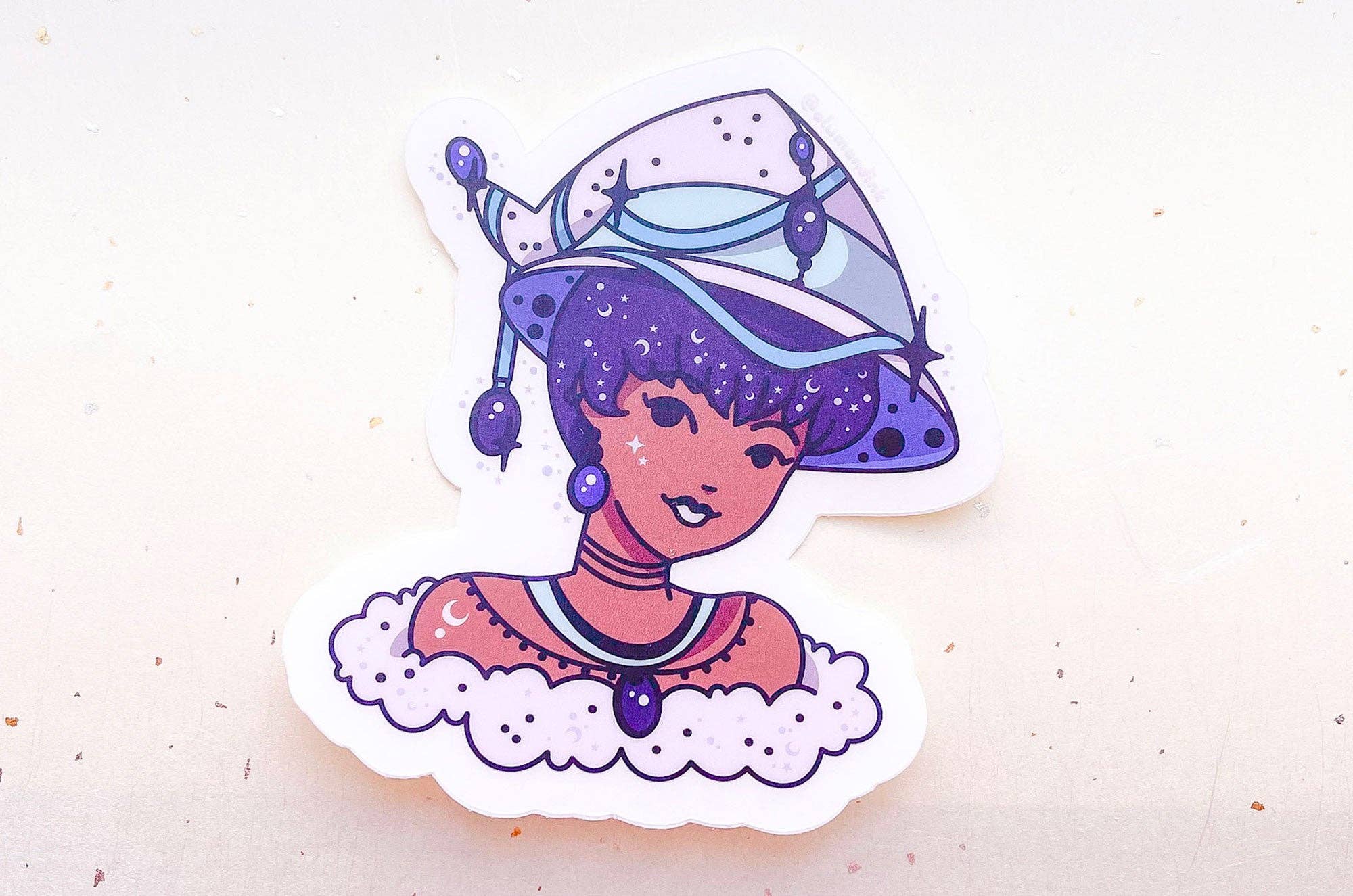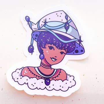 Add a touch of quirkiness with our 3 Inch Sticker Pierrot Clown on the Moon BLACK Sparkle. This artistic sticker is water-resistant, making it a durable choice for your laptop, water bottle, or journal. When you choose Astral Weekend, you're not just getting a sticker - you're supporting West Coast artists and a range of American manufacturers. Plus, 10% of profits go to local Nisenan tribe and The Cofed, promoting food and land justice. Enjoy this little piece of California culture!