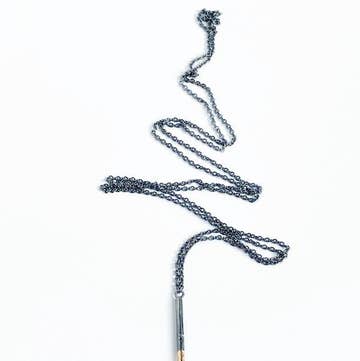 Simple, graphic, striking and easy to wear with just about any outfit, this long mixed metal necklace is worn effortlessly by popping it over your head. The claspless chain is 34" long, and the pendant is about 2.5" long. Can easily be worn layered with shorter necklaces for a little more drama. The chain is sterling silver and the hand forged and textured pendant is a mix of argentium silver and 14k yellow gold fill. Finish options are oxidized or bright silver. As always, all Shepherd's Run Jewelry is handmade in our Somerville, MA studio. Wholesale lead-times are generally 2-3 weeks depending on size of order and will be confirmed at time of order.
