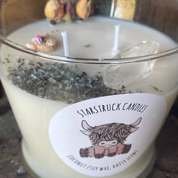 Everyone loves the Highland Cows! And this candle is too darn cute! Comes with a clay highland cow pendant, a piece of quartz, roses and crushed emeralds. Scented with Daisy scent. Made now in coconut and soy wax.