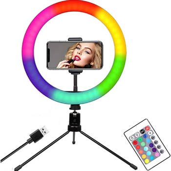 FLAWLESS GLOW: Our perfectly sized 10 inch selfie ring light provides a brighter, more even image, so you can look as good on camera as you do off! ADJUSTABLE HEIGHT: This adjustable phone tripod stand expands up to 60 inches in height and collapses down to 17 inches. Look good standing up or sitting down! DUAL PHONE HOLDERS: We all have a good side - let our LED ring light help you capture it! Our 360-degree phone stand comes with two holders so you can mount your phone in the center or below the circle. LIGHTING MODE: Customize your next photo shoot or video conference lighting. With 3 different lighting modes and 10 different brightness settings, Instagram and TikTok filters are a thing of the past!