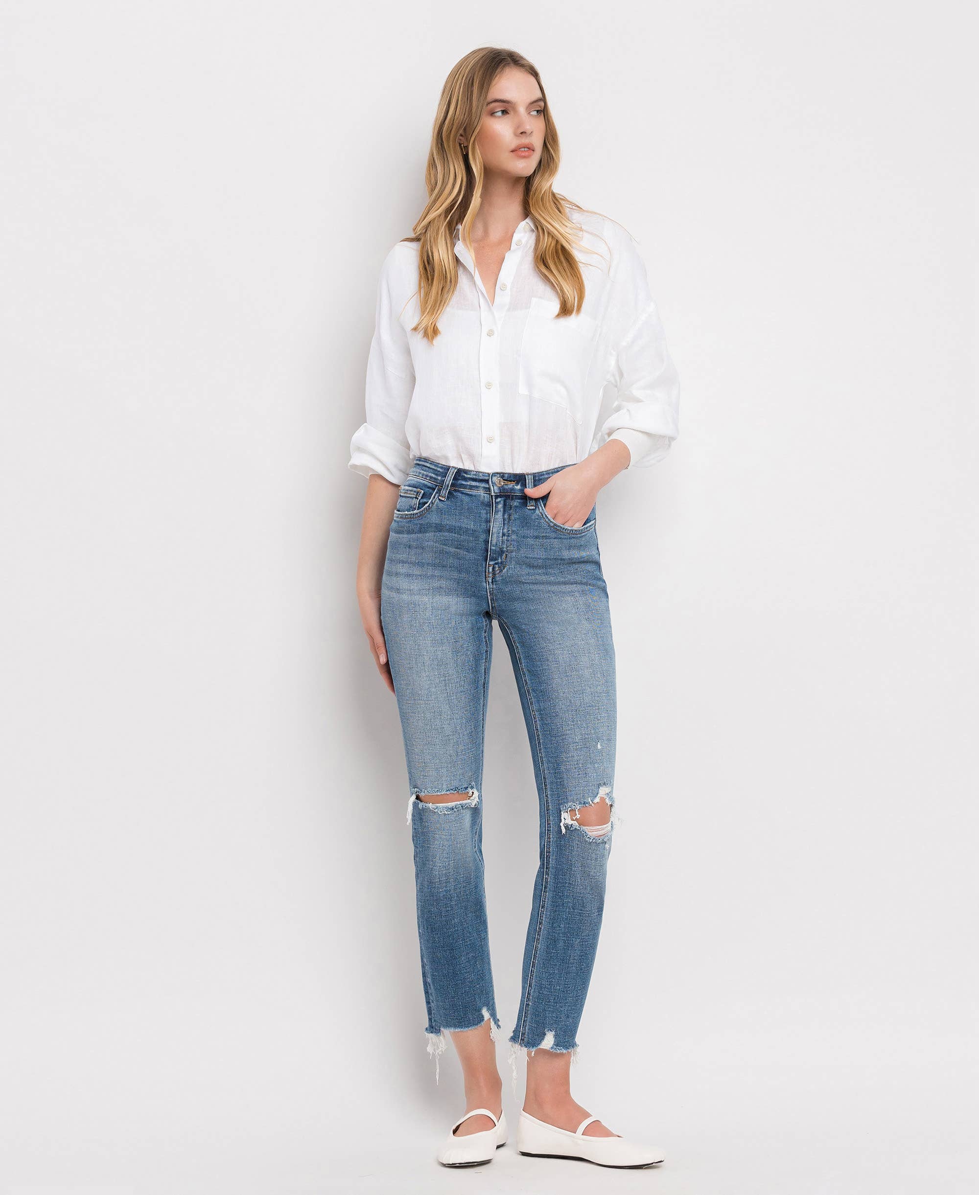BP455J - WHT - Hem Detail Comfort Straight