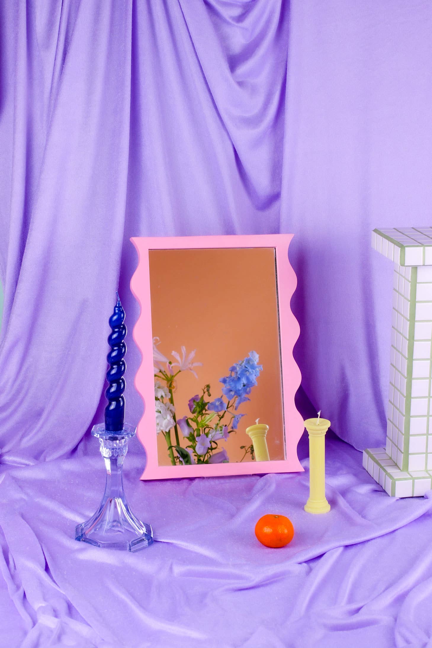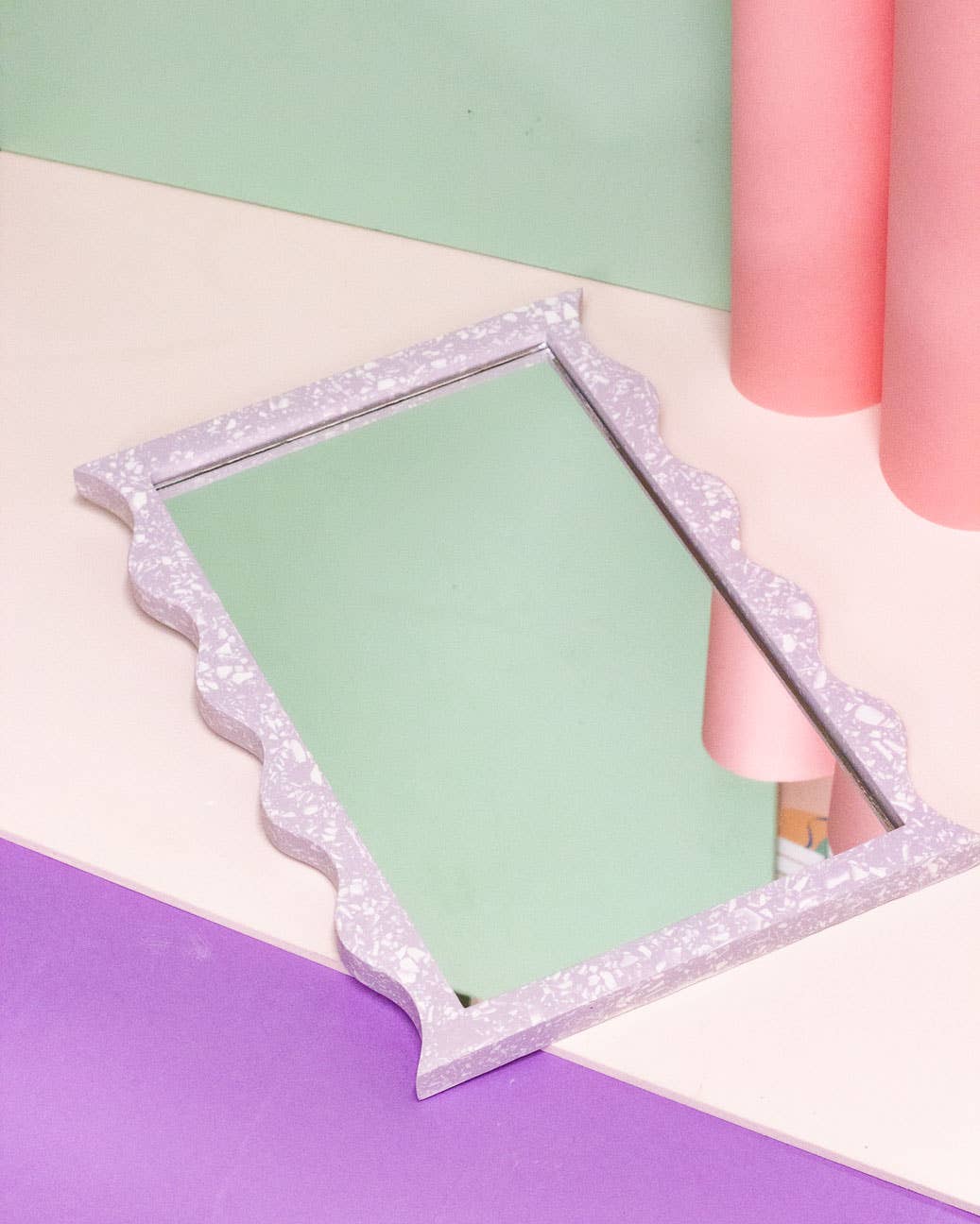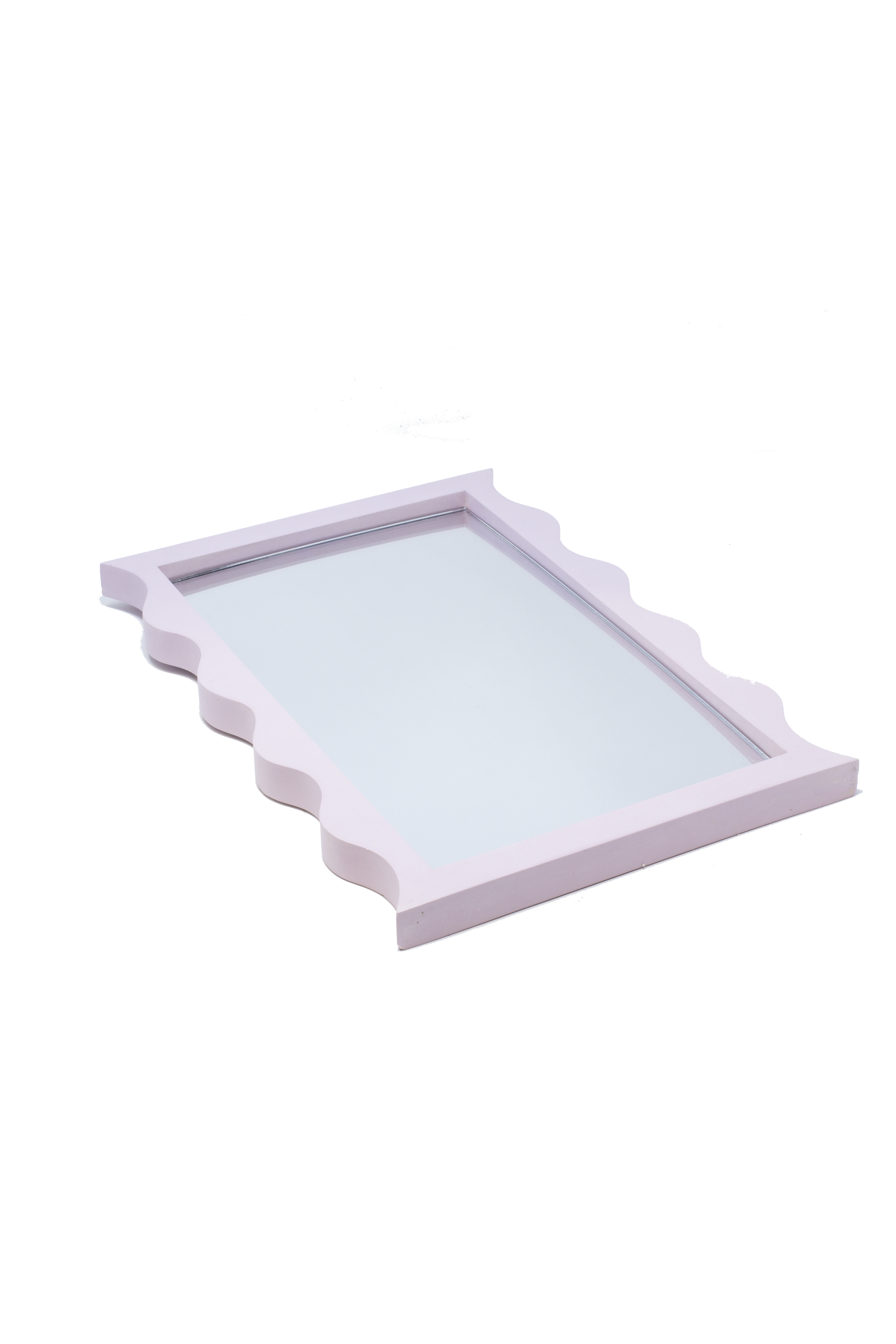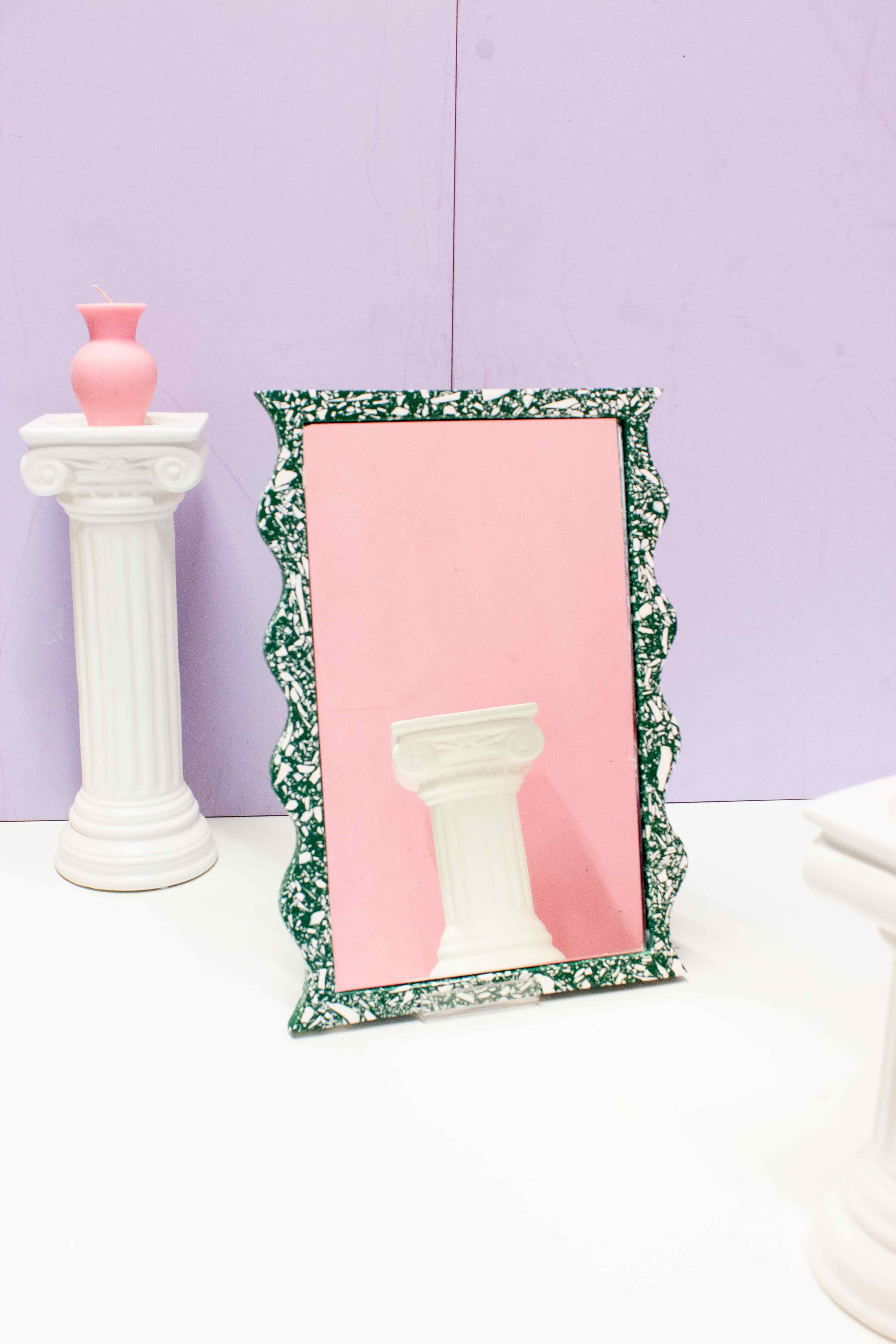 This large wavy mirror has been designed in our south east London studio Each one is carefully handmade from the material Jesmonite and finished with a glass mirror insert. Each mirror measures 35 x 25 x 1.7 cm To care for your wavy mirror please wipe it down with a microfibre cloth.