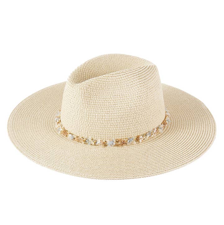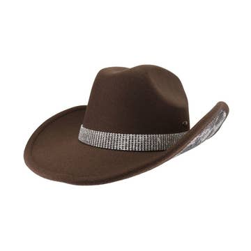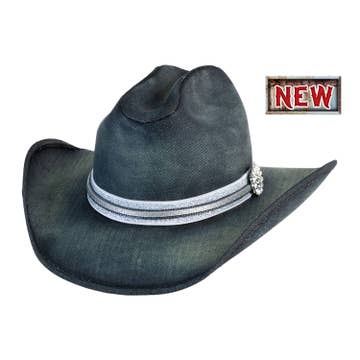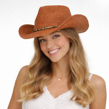 * This western cowboy hat is a striking boutique statement piece designed to stand out through texture and detailing. Crafted from woven straw with an exotic-inspired textured finish, it features a structured crown and shaped brim that maintain form while remaining lightweight and breathable. The decorative hatband is accented with mixed metal charms, adding a handcrafted, collected feel that gives the hat strong visual interest and boutique appeal. Ideal for festivals, concerts, travel, and everyday western styling, it’s a reliable spring and summer seller with crossover into early fall. Merchandises beautifully with denim, boots, flowy dresses, and western accessories, making it an eye-catching addition to front-of-store or lifestyle displays.