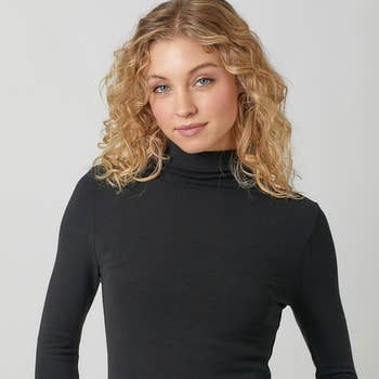 Micro rib long sleeve turtleneck. Hits right above the hip for a flattering fit. Masha is 5'9", a size 4, and is wearing an S 91% rayon 9% spandex Made in China.