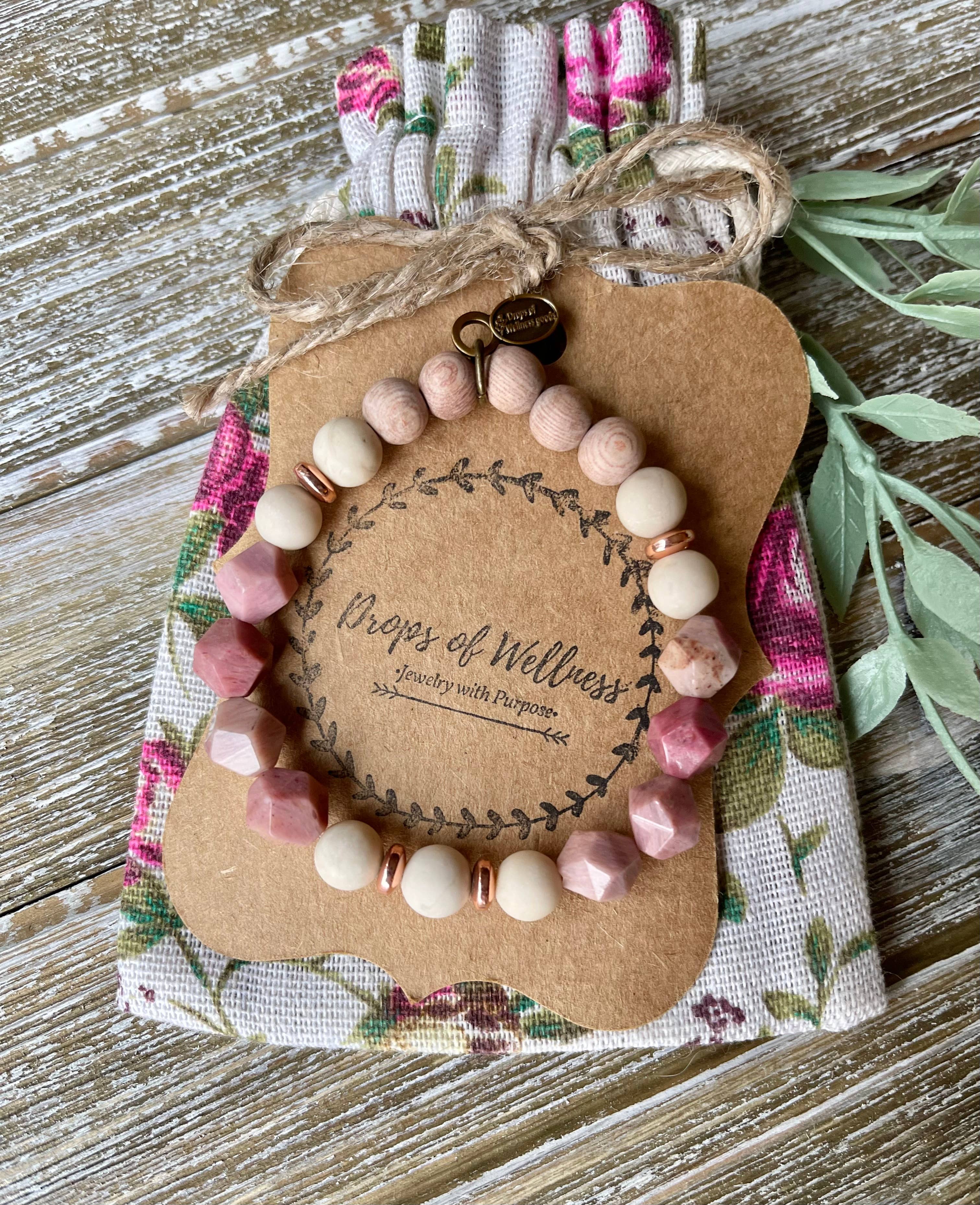 The Sweet Rose is designed with natural pink & grey zebra jasper stone along with raw rosewood diffuser beads. Stones are 8mm in size and can be stacked with other designs or worn alone. Each design is made with 1mm stretch cord that gives strength and allows for stretch. Simply add 1-2 drops of essential oil to the raw rosewood diffuser beads to enjoy the aromatic benefits throughout the day. Re-apply as needed. Each design is individually tagged to allow retailer to price.