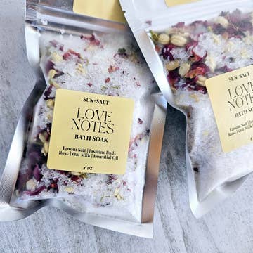 Handmade. Small Batch. Made with a blend of essential oils and natural ingredients. Love Notes Bath Soak Ingredients: Epsom Salt, Jasmine Buds, Rose, Oat Milk, Essential Oil Blend. 4oz - Single Use How to use: Empty desired amount into running bath water. Allow tub to dry for easy cleanup.