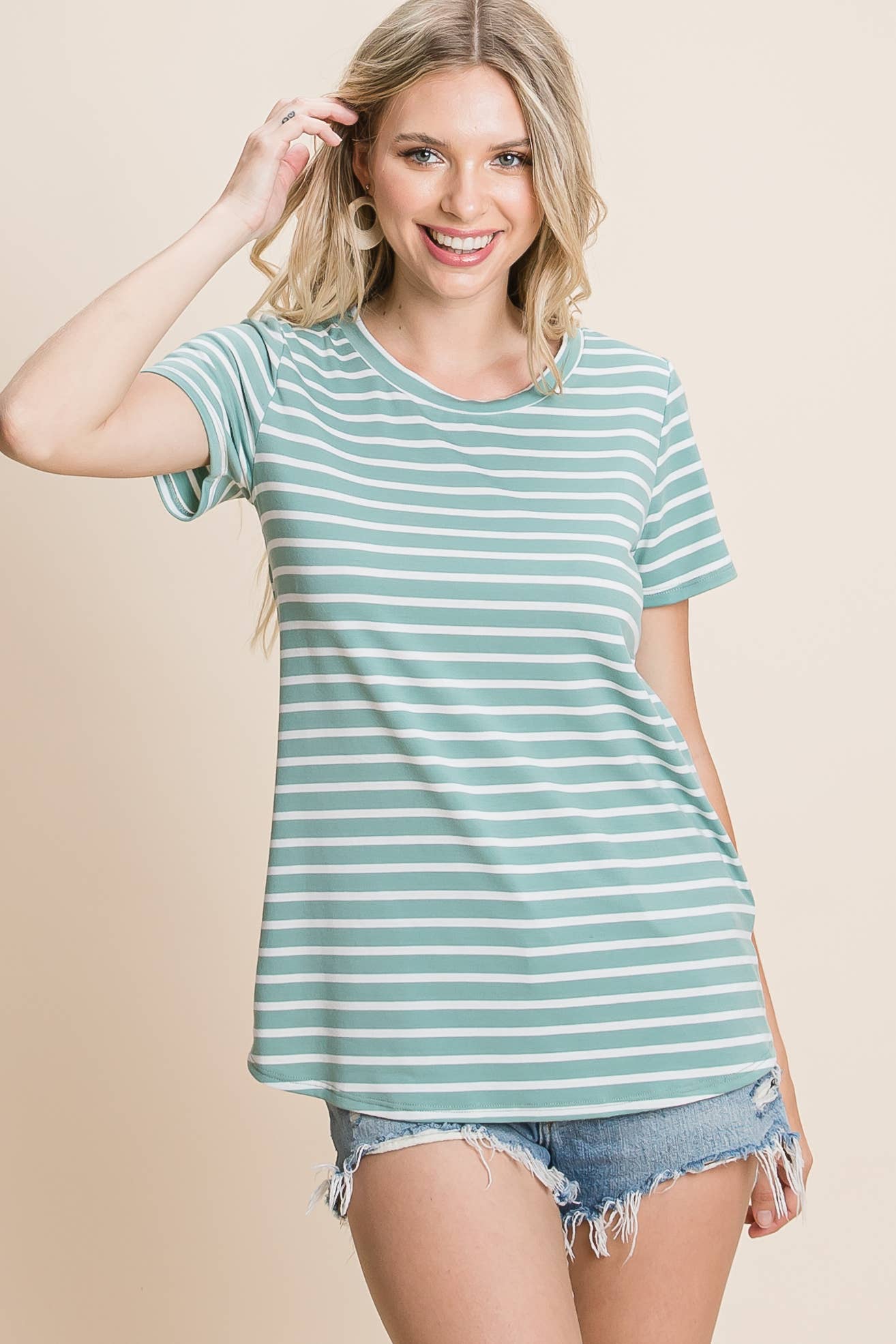 SKU: TA1789 Made in United States Aesthetic: Casual Care Instructions: Machine wash Fabric: 95% Rayon, 5% Spandex Fit: Contemporary Neckline: Round neck Occasion: Everyday Pattern: Solid Season: Spring/Summer Sleeve Length: Short Sleeve Weight: 226.8 g (8 oz)