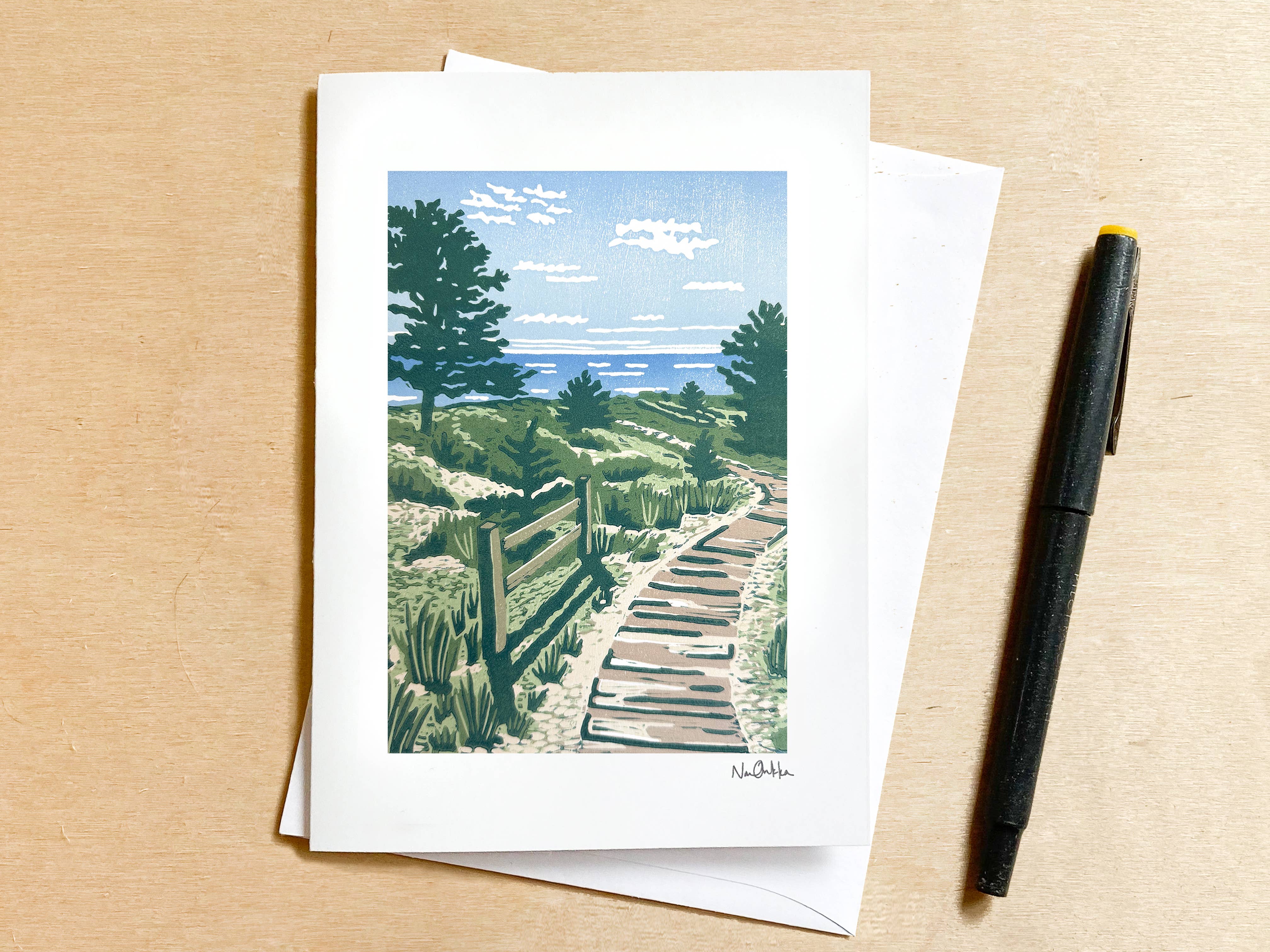 Looking for a uniquely beautiful greeting card that's both eco-friendly and locally crafted? You've come to the right place! Our blank greeting cards come in the standard A6 size and include white envelopes. Each card features one of Nan Onkka's stunning woodcut prints. The original woodcut was hand-carved by Nan in her home studio in Grand Marais, Minnesota. Your customers will love how versatile these cards are for any occasion. Our greeting cards are printed using sustainable methods by a green certified printer in Minnesota. Plus, each card is packaged in a plant-based clear sleeve, making it perfect for individual resale. Suggested retail price: $5.00 (With Clear EcoSleeve) / $4.75 (NO Clear EcoSleeve) Keywords: Midwest, Great Lakes, North Shore, Minnesota, Wisconsin, Michigan, Iowa, South Dakota, North Dakota, Ohio, Kansas, Corn Fields, Farming, Agriculture, Landscape, Prairie, Farm, America, Ontario, Field, Clouds, Grass