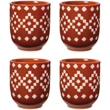 * Sold as a set of 4, these mugs are a harmonious blend of classic design and modern functionality. Crafted with attention to detail, they are the perfect choice for enhancing your coffee or snack time experience. Comes with 4 Spoons and Covers. * This exquisite set of coffee mugs is available in a muted color palette that includes rich red, burnt orange, soothing cloudy blue, and elegant beige. These muted hues add a touch of sophistication and versatility, making them suitable for a variety of settings and occasions. Whether you're enjoying your morning coffee or indulging in an evening hot cocoa, these mugs will elevate your drink experience.