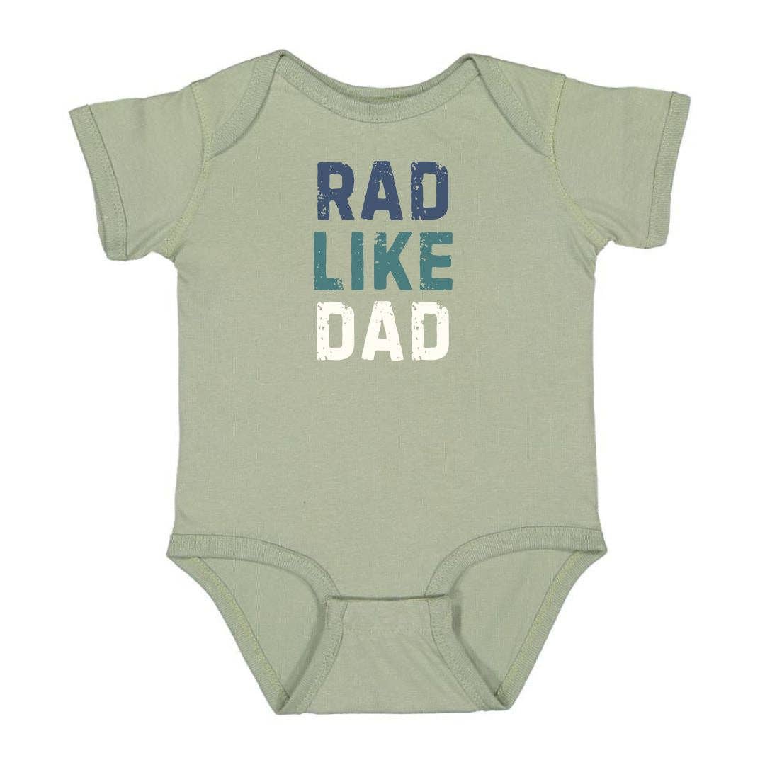 The Rad Like Dad Short Sleeve T-Shirt is a fun and handsome t-shirt for boys celebrating Father's Day or for showing love to Dad all year round! Features: * Shirt Color: Sage * Graphic Color: Indigo, Steel Blue, White * Material: 100% Cotton * Features: Tagless inside neck label for an itch-free wear * Fit: Toddler Unisex; True to Size * Care: Machine washable, tumble dry low, wash with like colors Each t-shirt is hand pressed with love using baby and child safe inks.
