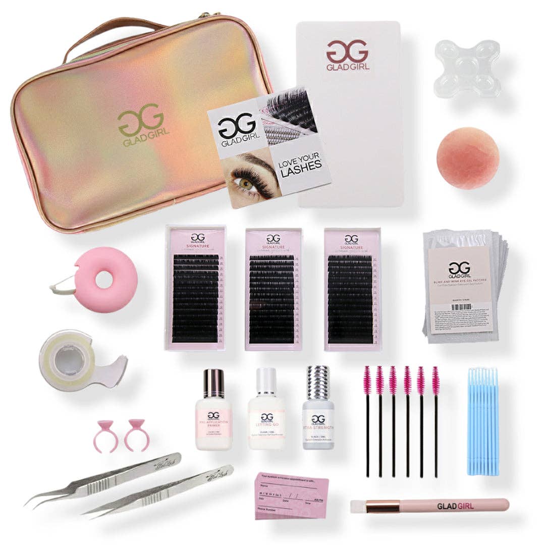 The GladGirl Volume & Mega Volume Eyelash Extension Practice Kit is our deluxe practice kit, packed with all the products you need, and a little extra to get creative and spice it up. Mannequin face, lashes (volume, mega volume, and colored), tweezers, glue, glitter, lash map practice sheets, and more are included to help you perfect your craft. Practice lash isolation, create beautiful fans, plan out your lash mapping and add some color and glitter to your life and lashes. Your kit arrives in our GladGirl Rose Gold Travel Case and you'll also receive an I love GG necklace as our special gift to you! When you purchase this eyelash extension starter kit with a mannequin face you will save over 30% off the cost of the separate items.