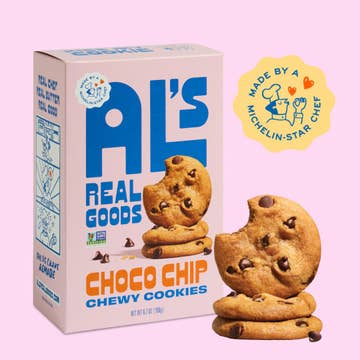 6 count case. Wholesale 5.40 / box, MSRP 8.99 / box At AL’s Real Goods, chewy comes first. Our Chewy Choco Choco Cookies capture the rich taste of brownie corners in cookie form—made with a special cocoa blend, extra chocolate chips, and a chewy texture that hits just right. Remade by a legit Michelin-starred chef, these cookies bring Mind-Blowingly Taste right onto your shelves. Chewy with a side of attitude, AL’s Real Goods started as a kitchen project with Michelin-starred chef Aaron London and his daughters. Today, that simple idea has grown into a brand defined by comfort, craft, and character. Kiss my cookie—these aren’t just snacks, they’re a story. • Made with grass-fed butter, cane sugar & free-range eggs • Baked with artisan red wheat flour for chewy, nutty flavor • Crafted with a cocoa blend and extra chips for brownie-like depth • Shelf-ready cookie boxes for gift shops & grocery displays • Proven seller in gourmet cookies & artisan assortments • 6-month shelf life, ambient storage • Brand founded by Michelin-starred chef Aaron London • 3 cases per master carton, 6 boxes of cookies/case, $9.99 MSRP/box From grocery aisles to seasonal displays, these chewy cookies stand out as both a comfort snack and an artisan food story worth sharing. Stock them year-round as a go-to choice for gift shop snacks, holiday cookies, and artisan treats crafted with Non-GMO ingredients. Non-GMO snacks, chewy chocolate chip cookies, chocolate chip cookies, gourmet cookies, gift shop snacks, grocery store, snack cookies, chewy cookies, holiday snacks, cookies in a box, holiday cookies, best seller snacks, snacks in bulk, artisan food, artisan snacks