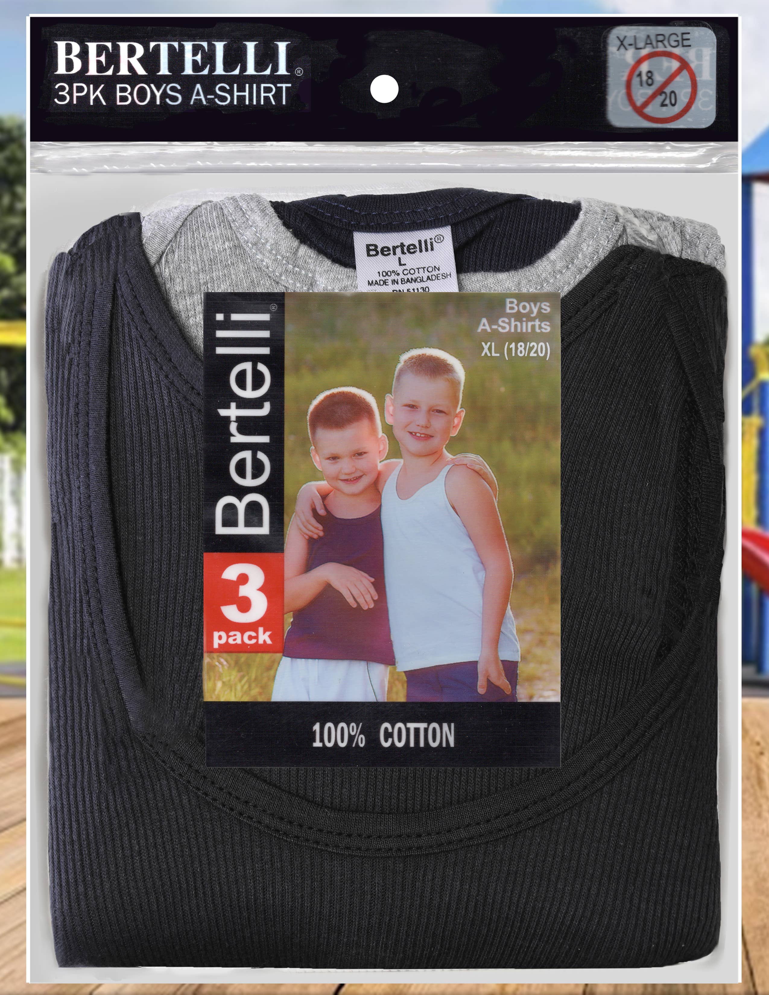 Introducing the Bertelli 3 Pack Boy's Cotton T-Shirt, White Undershirt, & Tank Tops, perfect for keeping your little one comfortable and stylish all day long. Features: *MATERIAL: 100% Cotton *Versatile Pack: Includes three essential pieces - A-shirt, white undershirt, and tank tops - providing options for various outfits and occasions. *Comfortable Fabric: Made from soft and breathable materials, ensuring maximum comfort for everyday wear. *Classic White Undershirt: The white undershirt offers a timeless look and serves as a versatile layering piece. *A-Shirt Design: Features A-shirt style tops, perfect for layering or wearing alone during warmer weather. *Durable Construction: Designed to withstand daily wear and tear, ensuring long-lasting quality and value. Product Information Sizes Option: S, M, L, XL Assorted Sizes option depends on the availability of the products. Colors: White
