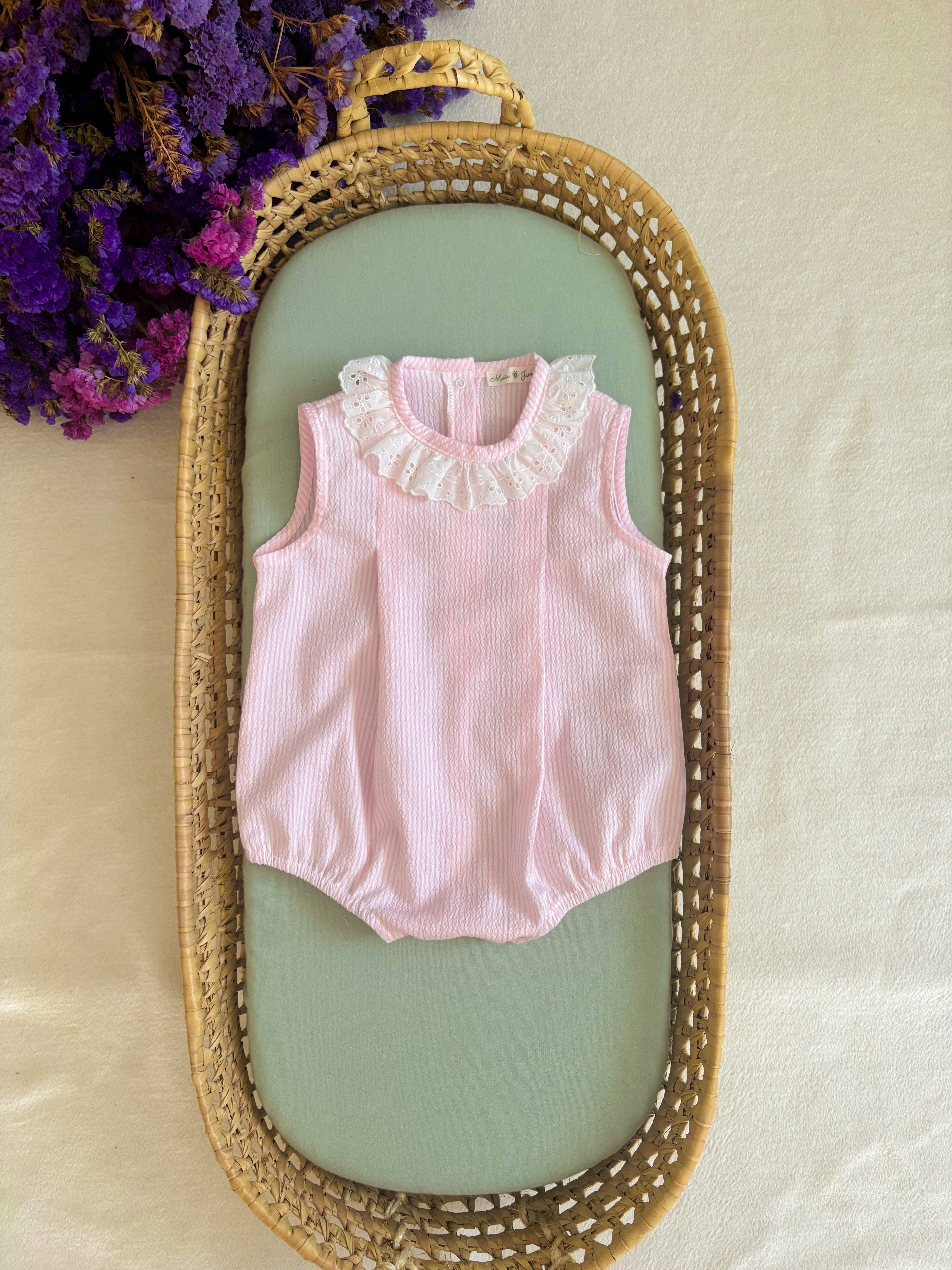 A timeless piece for your baby girl's wardrobe. Crafted in soft 100% cotton plumeti and fully lined for ultimate comfort, this charming blue onesie features a romantic ruffled collar and exquisite broderie anglaise lace trim. The refined button fastenings at the back and between the legs ensure ease of dressing. Composition: 100% cotton. Lined. Snap fastenings at the back and between the legs. Care Instructions: Hand wash only. Do not bleach or use chlorine-based products. Iron at a maximum temperature of 110ÂşC. Dry clean with care (no trichloroethylene). Dry flat in the shade, inside out.