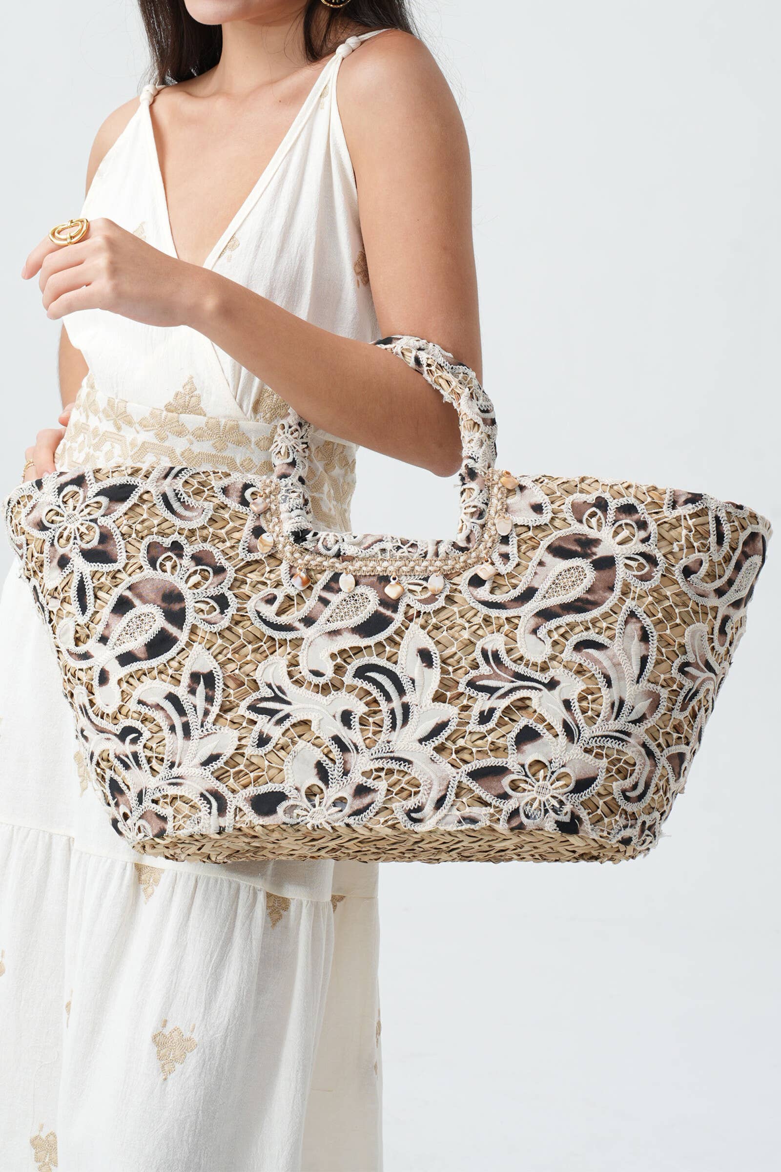 Add a touch of glamour and sophistication to your summer days with this straw tote. Delicate lace adorns the basket, while subtle sequins add an elegant and festive shine. This spacious tote is the perfect accessory for your city outings, beach days, or summer getaways, combining practicality and chic.