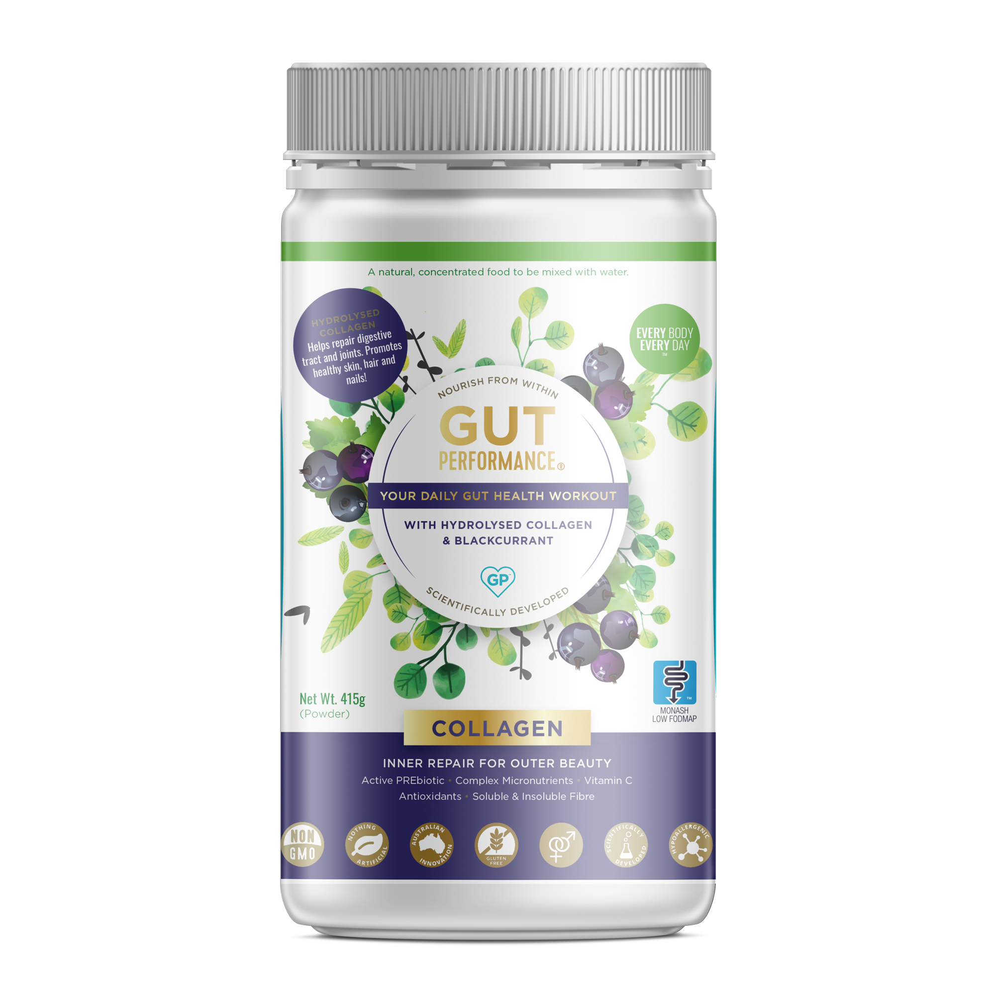 O nosso Ethos é '100% de Comida Natural como Medicina' Somos uma empresa familiar da Aussie consciente de saúde que tem uma missão desde 2011 para ter um impacto positivo no bem-estar das pessoas em todo o mundo com os nossos produtos Gut Health 100% Natural, australiano made. Trabalhando internamente com a nossa equipa científica Gut Performance para formular o nosso PreBiotic SuperMix exclusivo. O Melhor da Natureza, formulado pela Ciência. Cada ingrediente natural tem o propósito de gerir e manter a saúde intestinal. A nossa dose diária recomendada foi testada tanto em ensaios internos como externos por isso sabemos que funciona. Nossa mistura de fibra solúvel e insolúvel e amido resistente são todas necessárias para a melhor Gut Health, como recomendado pela Monash University. Com orgulho e oficialmente certificado Low FODMAP pela Monash Univeristy, líderes em gestão e suporte Low FODMAP. Ensaios e testemunhos da equipa científica Gut Performance, naturopatas e clientes dizem-nos que os ingredientes da Gut Performance apresentam resultados positivos na gestão dos sintomas de: • IBS • Inflamação intestinal • Obstipação • Bloating • Peso • Endo & PCOS • Níveis de glicose no sangue • Imunidade Sinta a Diferença em 7 dias!