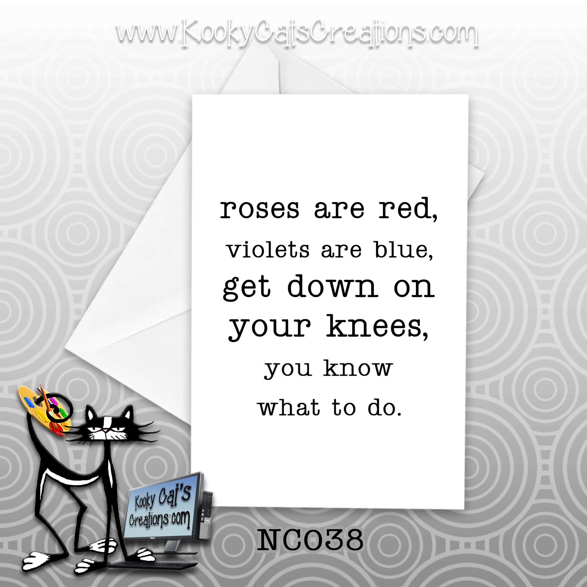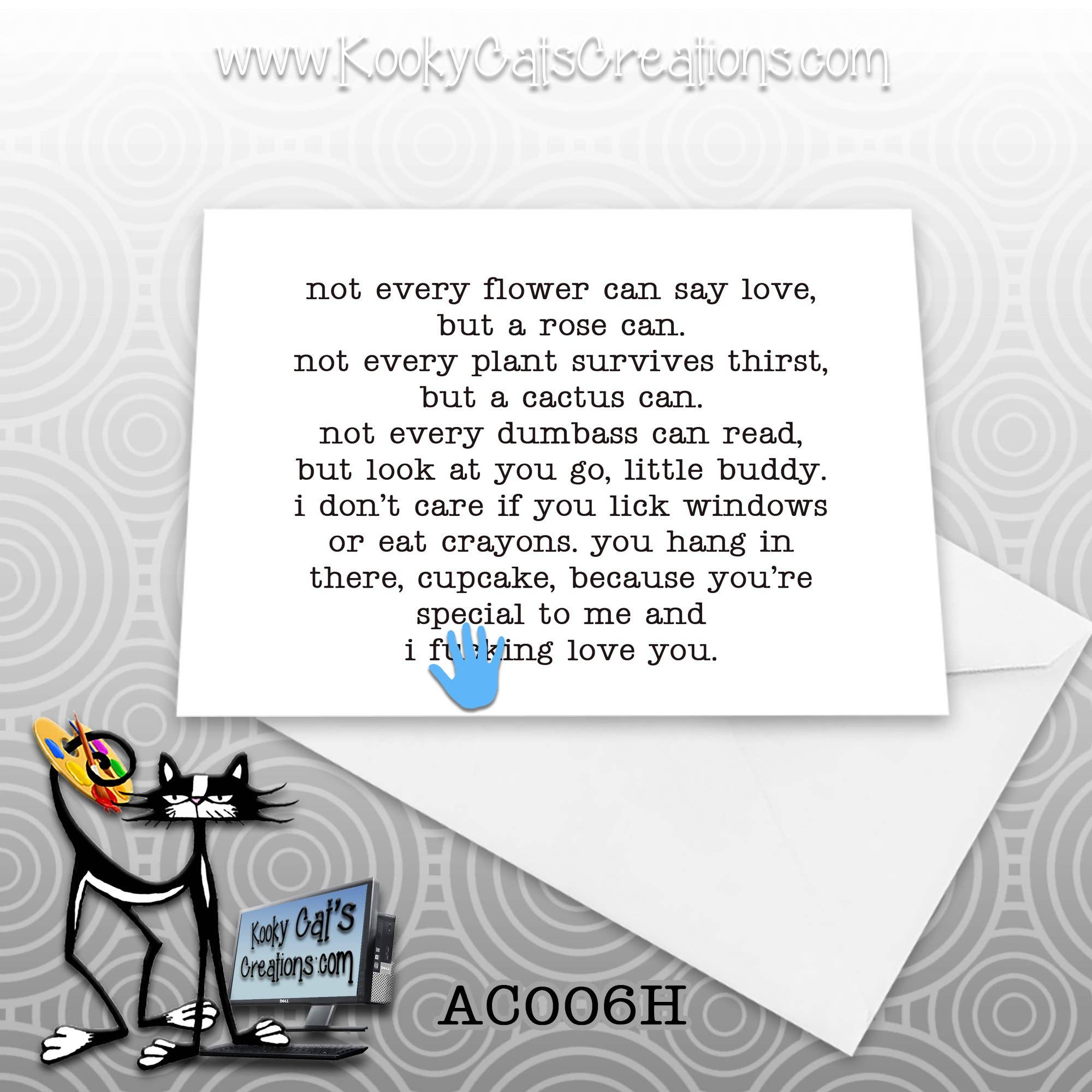Kooky Cat's Creations é uma linha de cartões comemorativos para qualquer ocasião ou nenhuma ocasião. Meus cartões são cartões modernos e não tradicionais, com humor espirituoso e risadas garantidas. Sexy, sarcástico e atrevido é o que você encontrará. Perfeito para quando você deseja enviar uma mensagem, mas não tem certeza do que dizer. Meus cartões são projetados, criados e enviados por mim, Kooky Cat. Sou uma empresa de uma pessoa dedicada à melhor experiência de atendimento ao cliente.