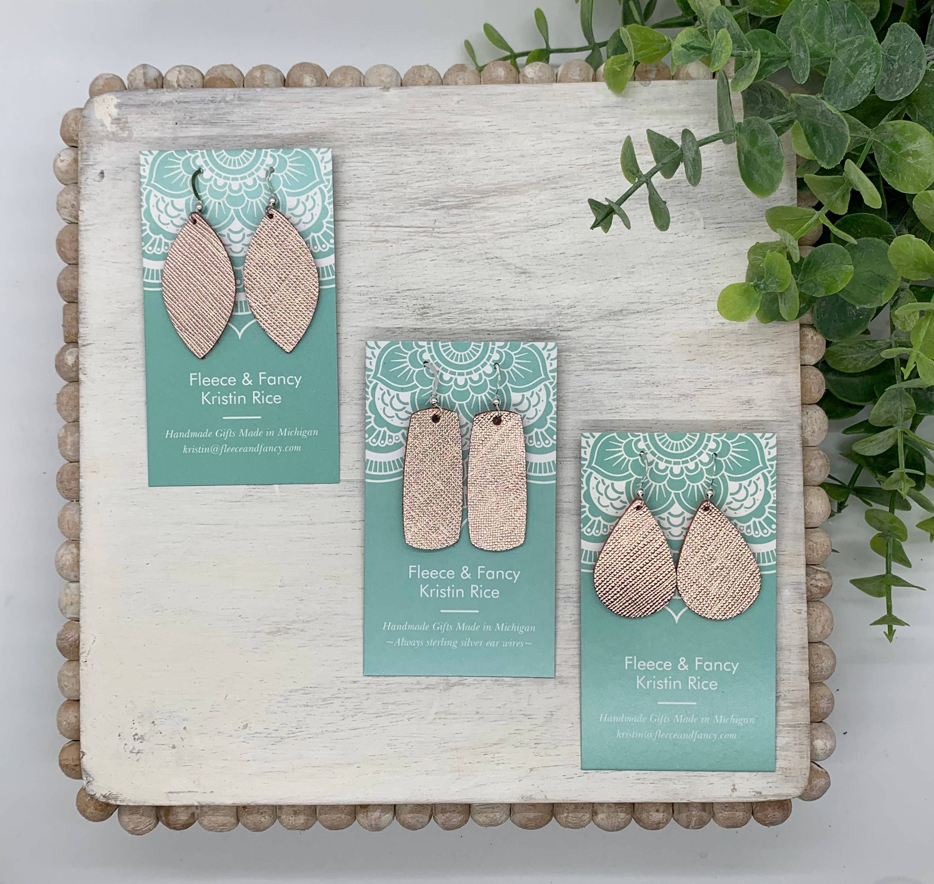 Fleece & Fancy é o resultado da paixão de Kristin Rice por criar coisas bonitas. Kristin acredita no poder de criar e que são as pequenas coisas que tornam a vida fabulosa! Coisas como garantir que você tenha luvas e um colar que combinem com suas botas altas ou o lenço e brincos certos para cada ocasião. Atualmente, a Fleece & Fancy atende mais de 35 lojas no meio-oeste e adoraria fazer parte de sua família de varejo. Todos os produtos são feitos à mão na Península Superior de Michigan. A qualidade é importante para que cada par de brincos seja feito de materiais de primeira linha e fios de orelha de prata esterlina. Se você vir algo de que goste, faça um pedido. Se você vir algo que o inspira a criar, MELHOR AINDA!