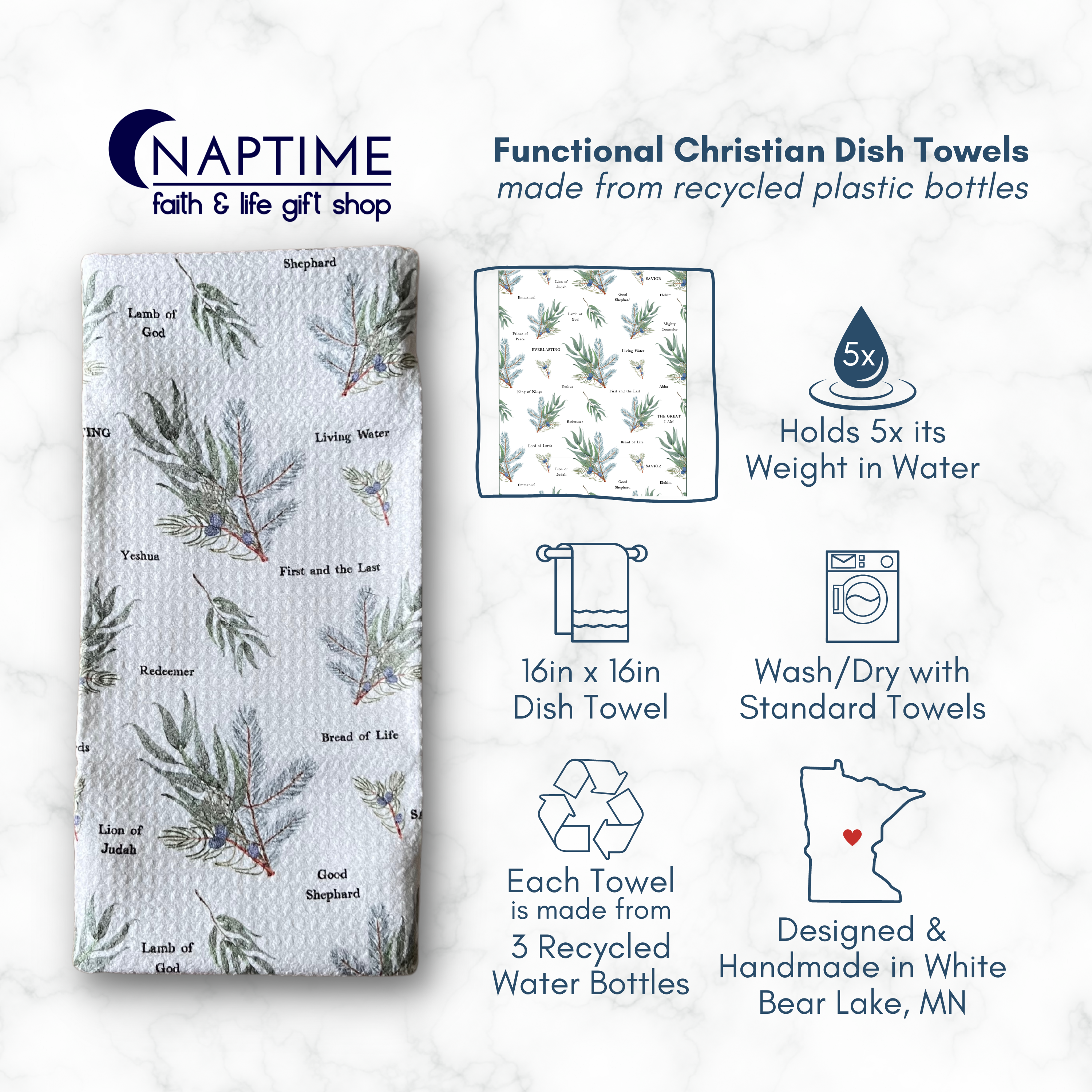 As nossas camisetas cristãs, decoração de parede com versos bíblicos, joias cristãs, canecas, são todas desenhadas e feitas à mão do início ao fim no nosso Brick & Mortar em White Bear Lake, MN! Adoramos fazer tudo isso para a glória de Deus e esperamos que você e os seus clientes sejam abençoados por eles! Em 2016 começamos a fazer jóias na nossa mesa da cozinha enquanto os nossos pequenos estavam a cochilar! Uma coisa leva a outra e em 2018 Deus presenteou-nos com uma maravilhosa loja online e um negócio de tijolo e argamassa chamado Naptime Faith & Life Gift Shop. Somos tão abençoados por ter encontrado a Faire e abrir a nossa aventura a mais negócios em todo o país! Deus te abençoe! Michelle