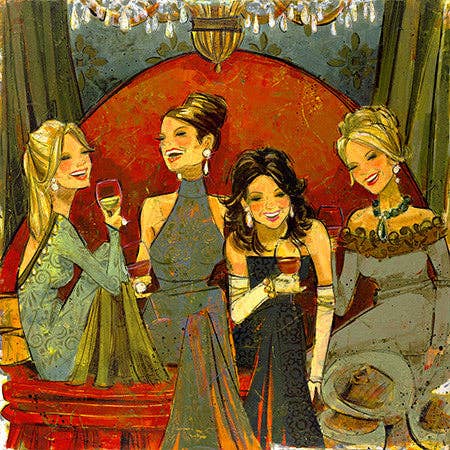 Digo às pessoas que vivo vicariantemente através das minhas pinturas. Grande parte da criatividade no meu trabalho está focada nos trajes ou no design de moda das minhas mulheres. Como antigo ilustrador de moda/designer gráfica do Austin American Statesman, a enorme mudança para computador gerava imagens no final dos anos 80 significava que eu não estaria a desenhar nem a ilustrar tanto, deixou um vazio, como precisava de estar a criar. Tendo sempre pintado ao longo da minha vida, decidi pegar novamente nas minhas pincéis, mas com mais propósito. Comecei com festivais de arte locais, pegar em comissões, viajar para espetáculos fora do estado. Em pouco tempo, o meu trabalho começou a dar frutos e logo tive um seguinte que cresceu e se espalhou de boca a boca (as mulheres falam). A série Women and Wine cresceu para além da minha imaginação, há mais de 40 imagens na série. A Kathy sempre se considerou uma ilustradora, quer trabalhe em papel ou tela, e o seu trabalho reflete isso mesmo. A série Women and Wine retrata muitas vezes mulheres que estão a rir e felizes. Kathy disse: “Como artista, “sou atraída pelo imaginário dramático, ou emocionalmente provocador, “por isso acho que estava a tentar captar a emoção do momento. Valorizamos as nossas amizades, por isso, a natureza disso é muito relacionável para a maioria das mulheres e obviamente teve um amplo apelo.”