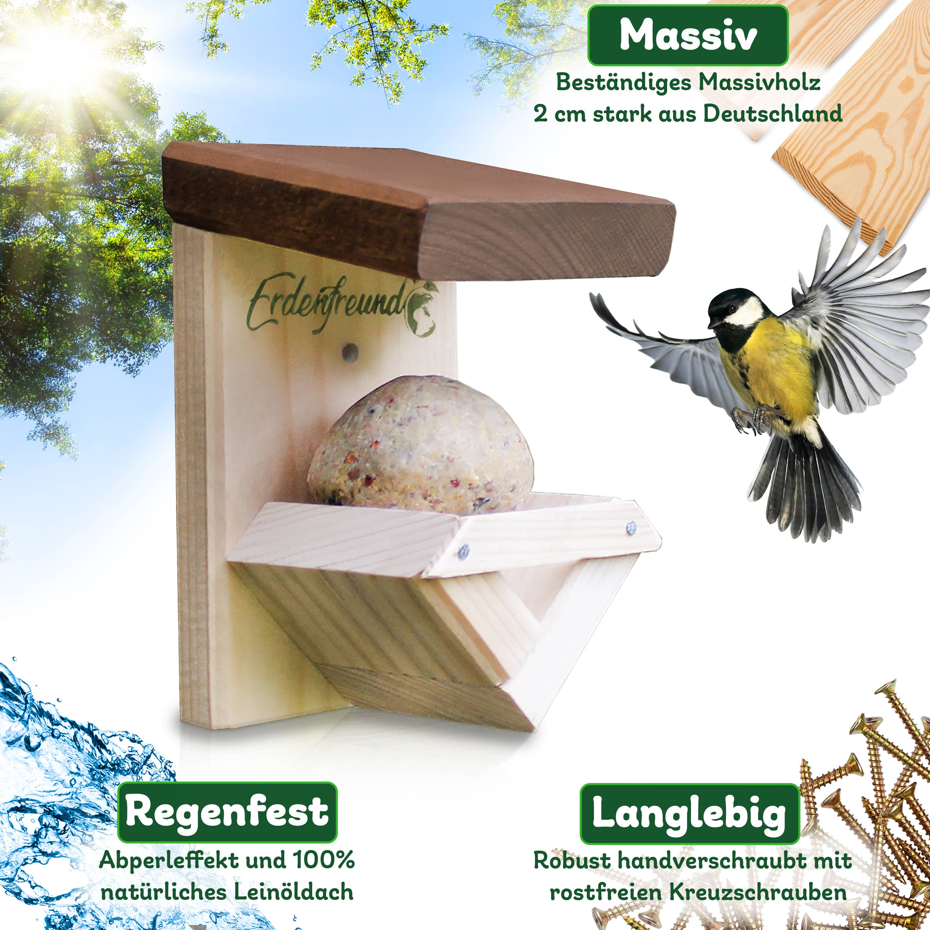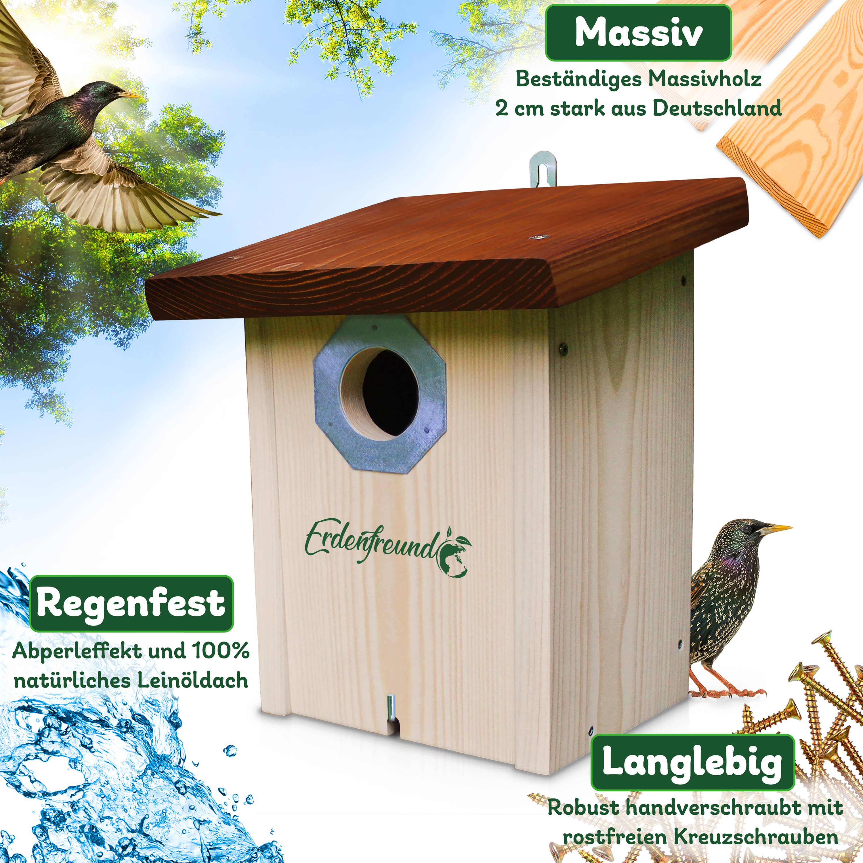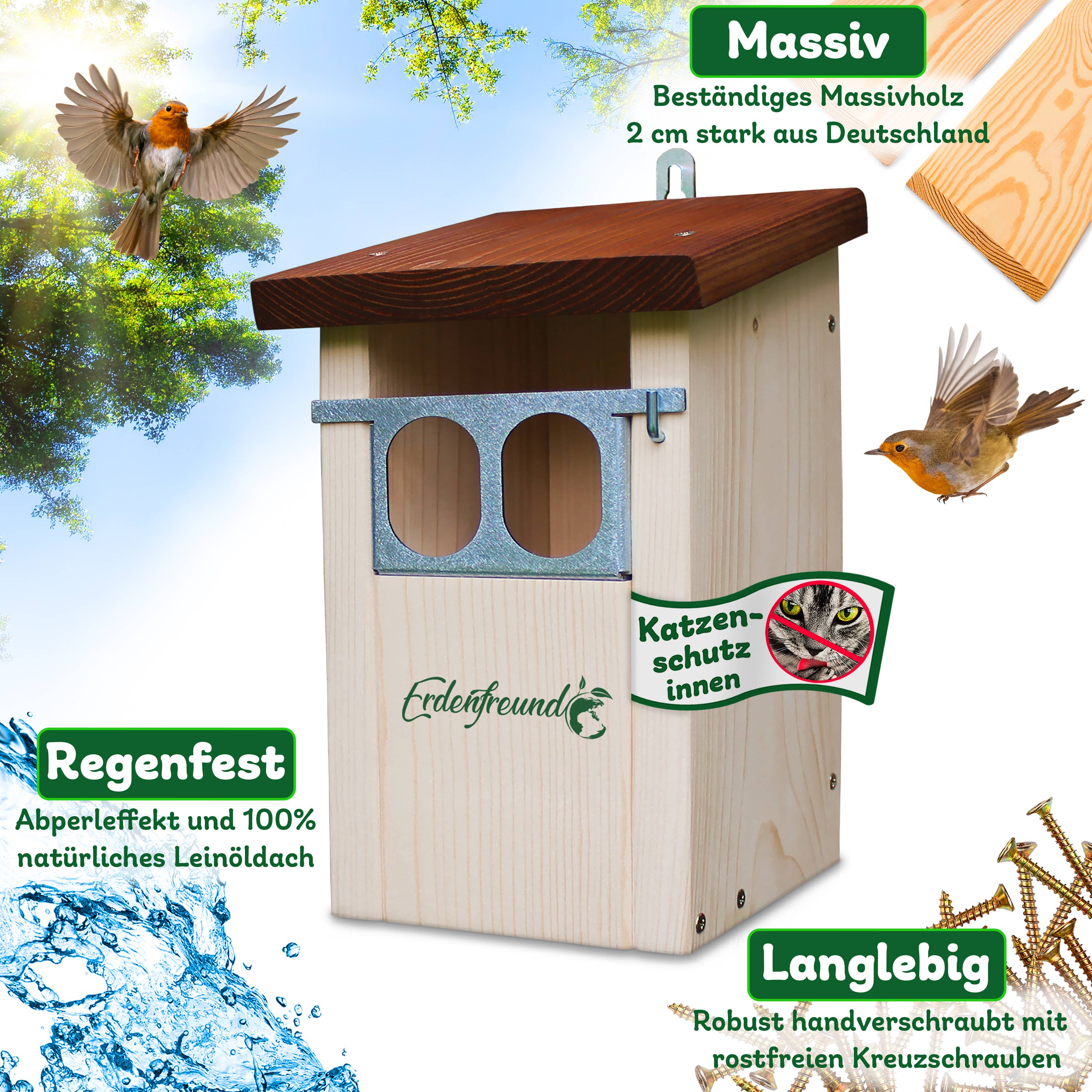 Até 2026, criaremos habitat para mais de 2 milhões de animais selvagens nativos e combateremos efetivamente a extinção de espécies com 178.794 caixas-ninho e casas de alimentação! As casas de ninho, casas de alimentação e casas de insetos ERDENFREUND® são provavelmente as casas de vida selvagem mais de alta qualidade e amigáveis para os animais da Europa! 100% artesanato da Renânia-Palatinado feito de madeira maciça regional de 2 cm certificada pelo FSC! A hora de nascimento da empresa ambiental e de proteção animal ERDENFREUND®, muito amigável aos animais, remonta ao ano de 2018. A história de sua origem é guiada pelo desejo profundo de devolver à natureza e ao mundo animal o que o ser humano lhes tira. Assim como pela nossa visão de, com um habitat 100% adequado e amigável aos animais, promover uma convivência harmoniosa entre humanos e animais. Nossas ações diárias são determinadas pela nossa missão de proteção animal de parar a extinção extrema de espécies e garantir a longo prazo a continuidade da nossa fauna nativa.