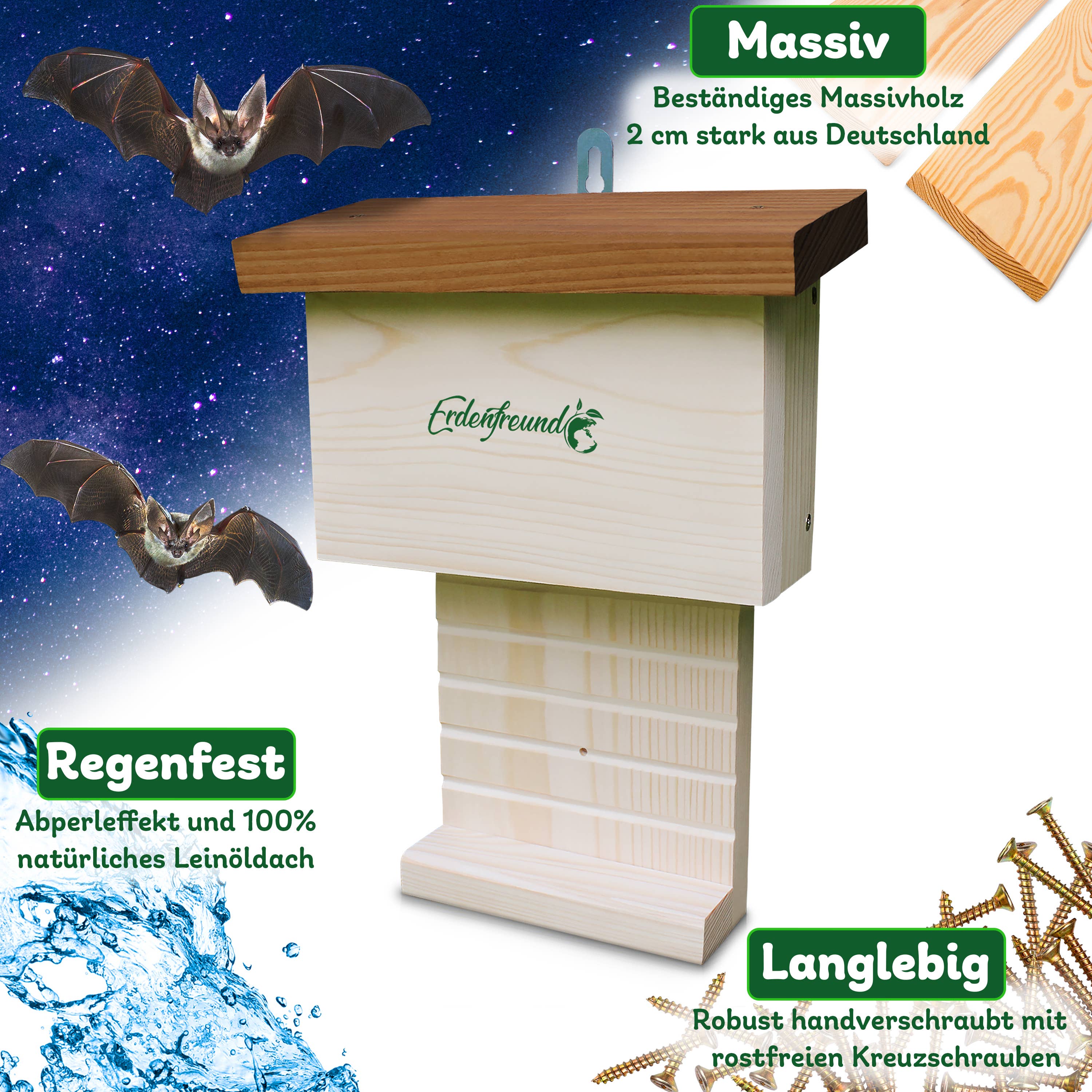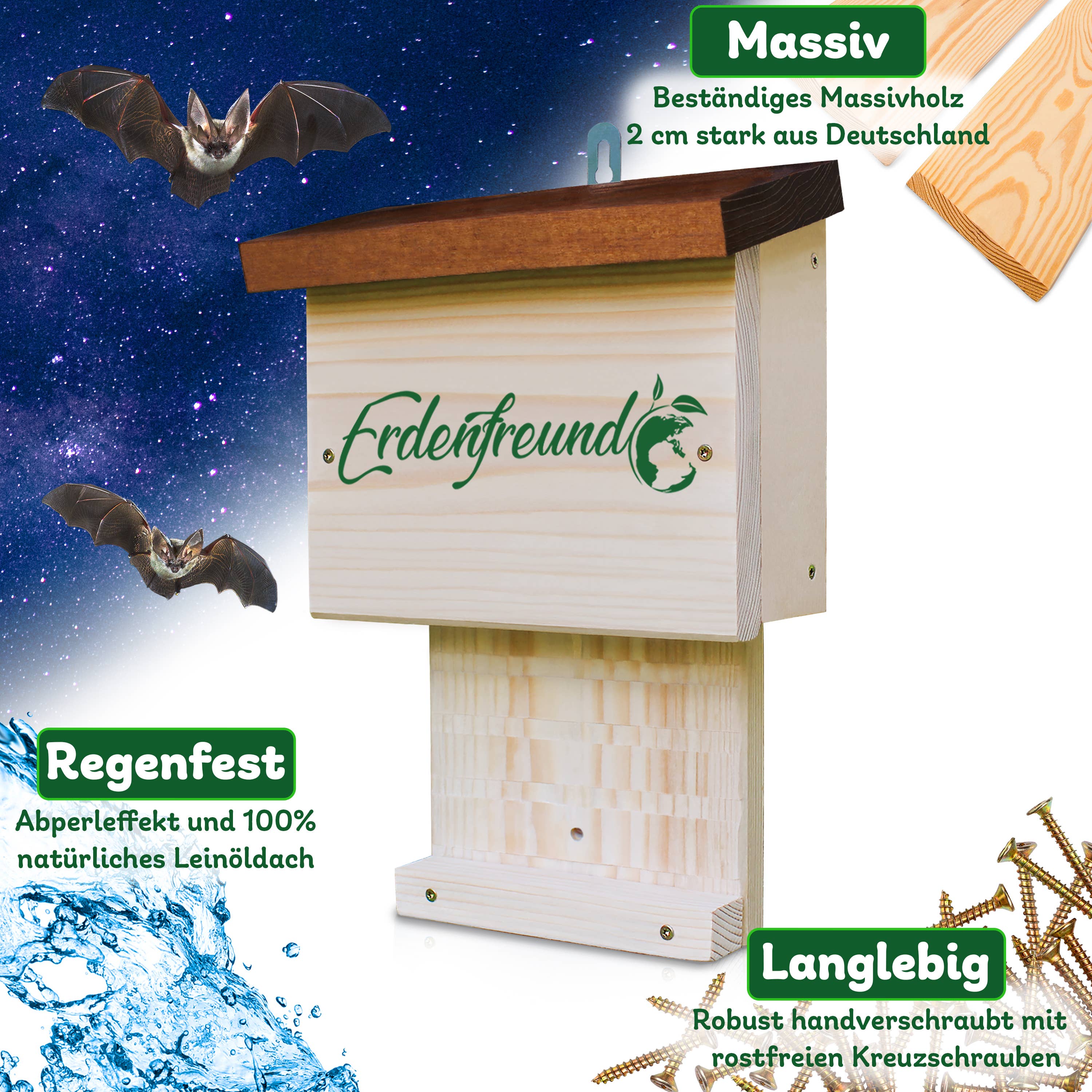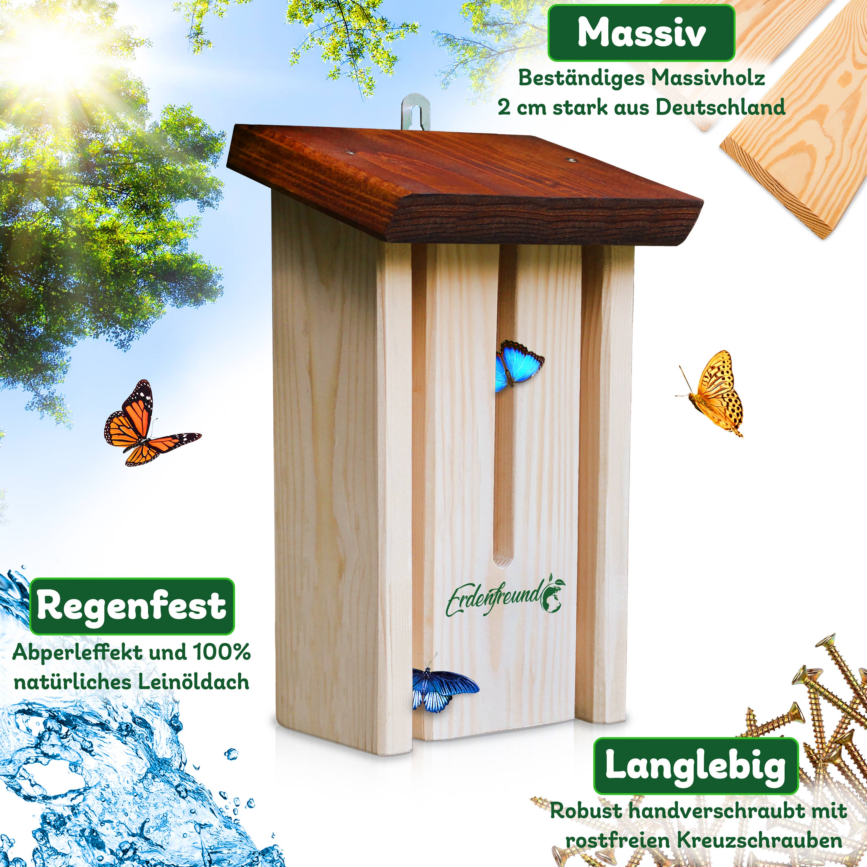 Até 2026, criaremos habitat para mais de 2 milhões de animais selvagens nativos e combateremos efetivamente a extinção de espécies com 178.794 caixas-ninho e casas de alimentação! As casas de ninho, casas de alimentação e casas de insetos ERDENFREUND® são provavelmente as casas de vida selvagem mais de alta qualidade e amigáveis para os animais da Europa! 100% artesanato da Renânia-Palatinado feito de madeira maciça regional de 2 cm certificada pelo FSC! A hora de nascimento da empresa ambiental e de proteção animal ERDENFREUND®, muito amigável aos animais, remonta ao ano de 2018. A história de sua origem é guiada pelo desejo profundo de devolver à natureza e ao mundo animal o que o ser humano lhes tira. Assim como pela nossa visão de, com um habitat 100% adequado e amigável aos animais, promover uma convivência harmoniosa entre humanos e animais. Nossas ações diárias são determinadas pela nossa missão de proteção animal de parar a extinção extrema de espécies e garantir a longo prazo a continuidade da nossa fauna nativa.