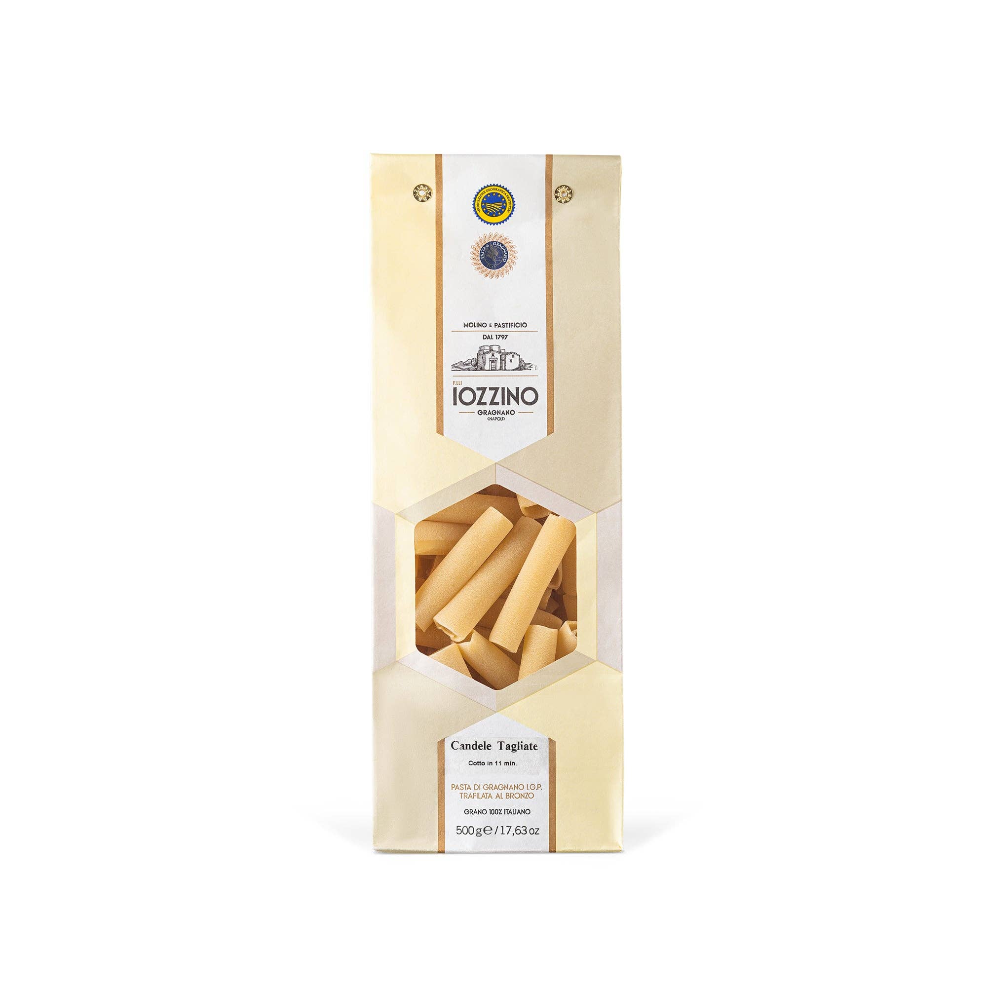 O nosso primeiro moinho familiar remonta a 1797, chamava-se 'Lo Monaco' e era um dos mais antigos no “Valle dei Molini” em Gragnano e ainda está lá hoje. O nosso antepassado, Marcantonio Iozzino, começou a trabalhar o trigo italiano no nosso moinho familiar, para produzir uma massa de alta qualidade. Desde então, a massa de Gragnano faz parte da nossa tradição familiar. Para obter a certificação IGP, a massa deve ser produzida com águas das nascentes de Gragnano. A produção deve seguir um determinado regulamento fornecido, e essa é a única maneira de fazer parte desse nicho de mercado que nos fará destacar com um produto de alta qualidade. A nossa massa é um produto muito simples, feito com apenas dois ingredientes: sêmola de trigo duro 100% italiana e água das nascentes de Gragnano. Antes de proceder à produção, a sêmola é peneirada para verificar a sua pureza. A nossa massa é produzida com matriz de bronze para obter várias formas e seca a baixa temperatura em células estáticas. Damos grande importância à 'lentidão', não à 'velocidade de produção': secagem, arrefecimento e estabilização são as três fases em que a massa repousa entre 24 e 60 horas, dependendo da forma que queremos alcançar. Graças à qualidade dos ingredientes e ao respeito pelos tempos de secagem, a nossa massa tem aquela consistência e rugosidade particular, necessária para qualquer tipo de combinação de condimentos.