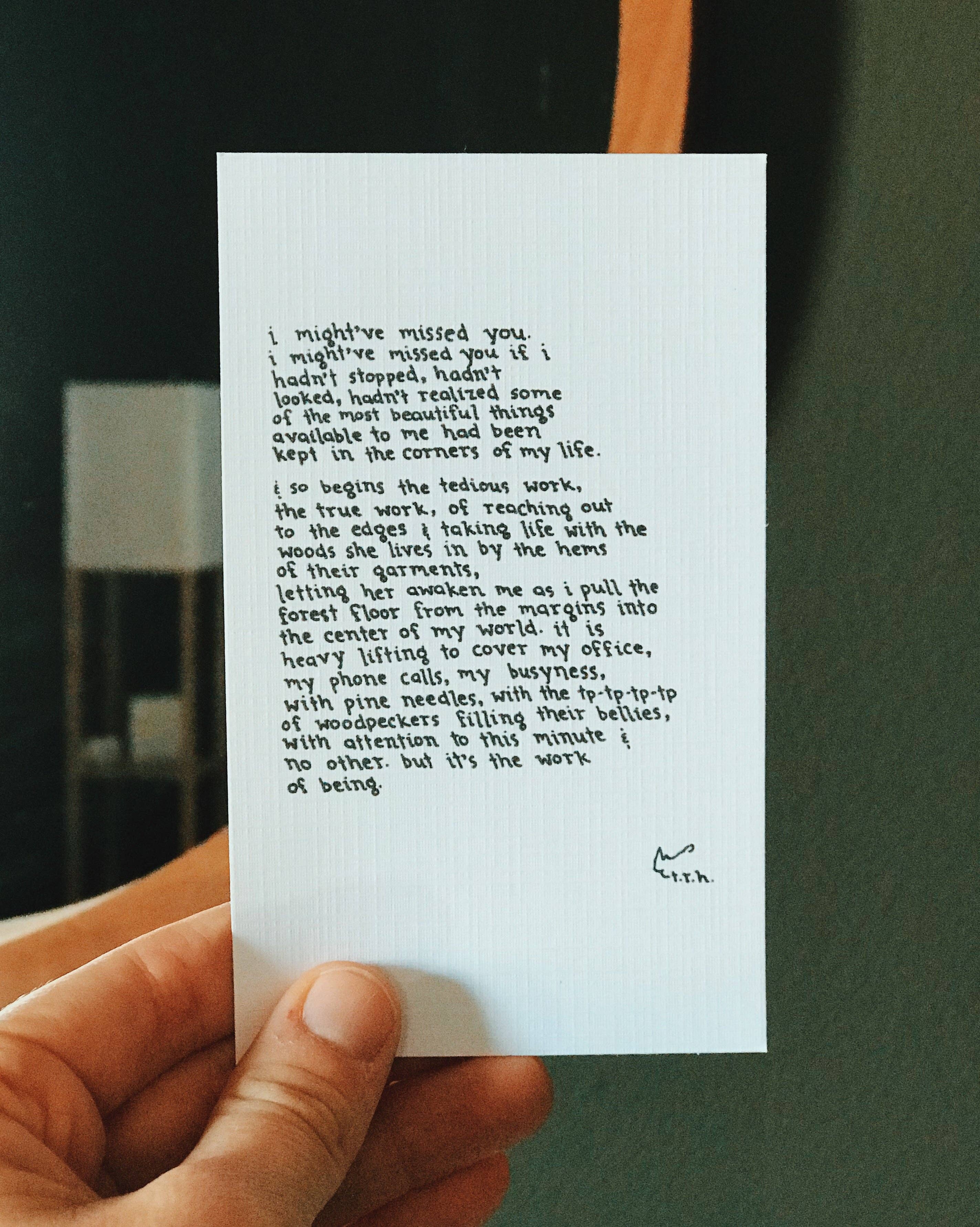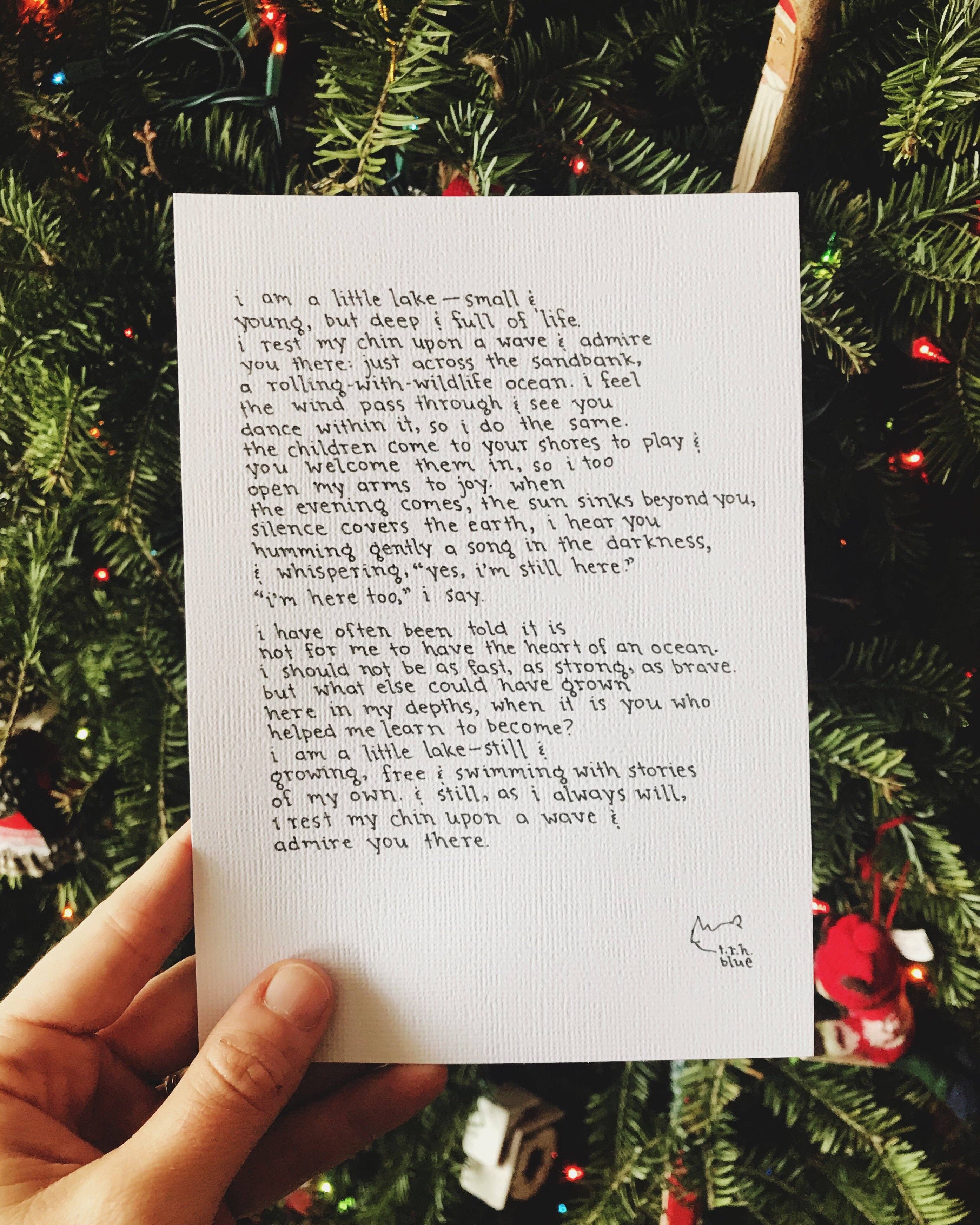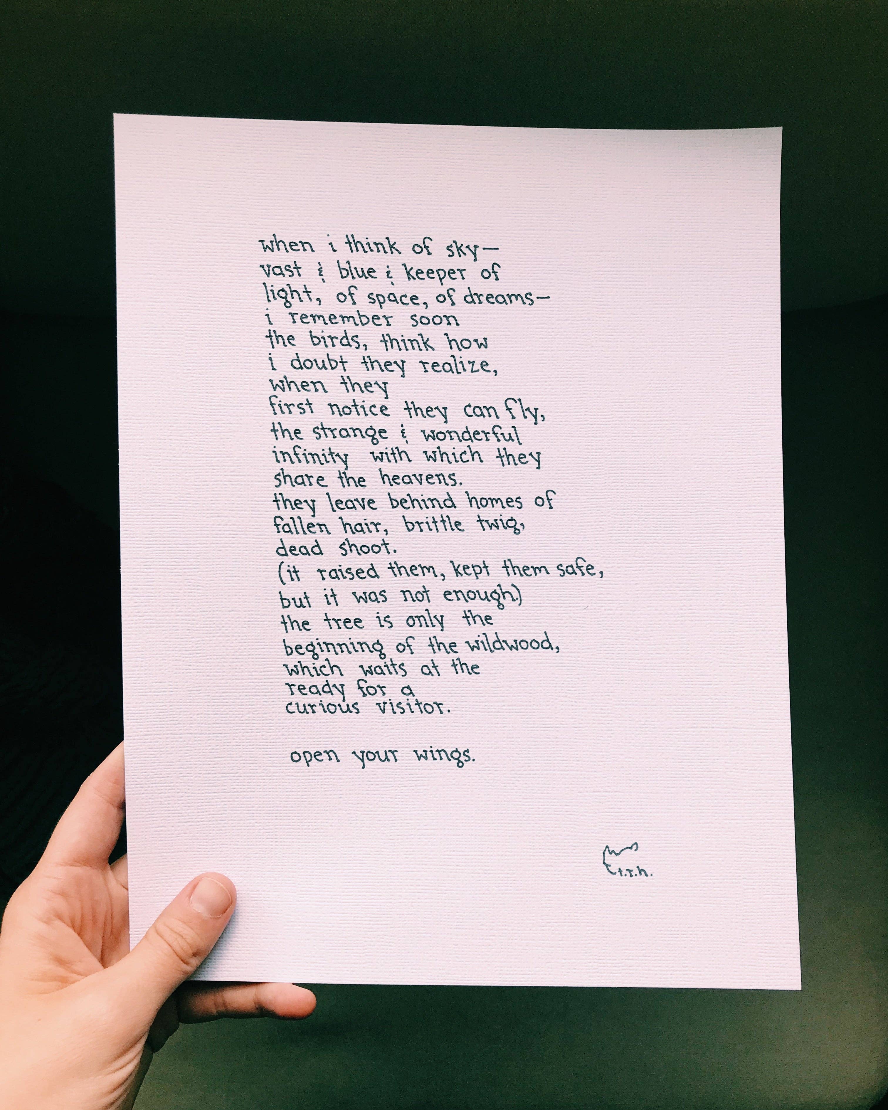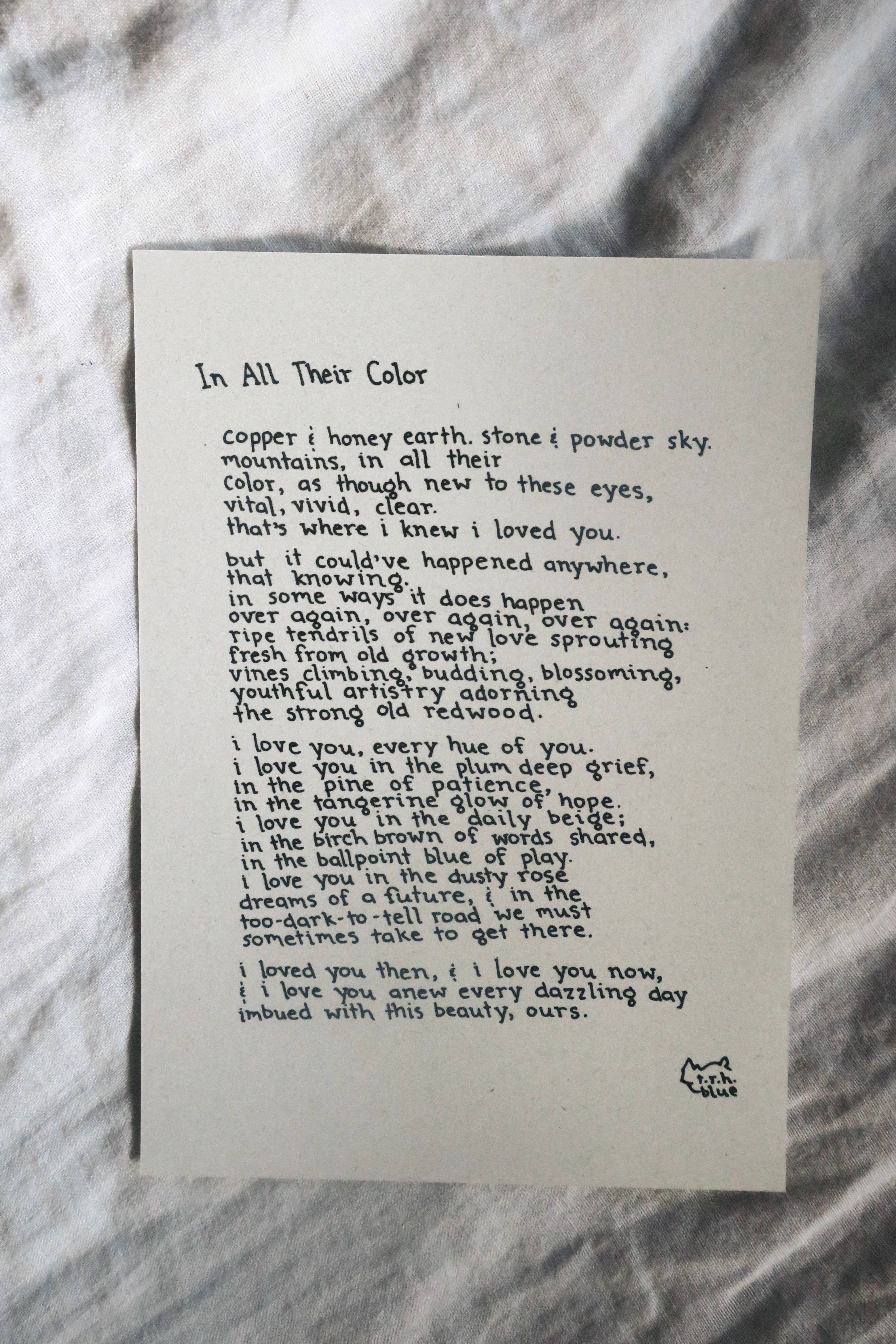 NOTAS SONTHEWAY foi iniciado em 2015 pelo poeta e ensaísta t.r.h. blue. Com o objetivo de tornar a poesia pessoal e acessível, a azul iniciou um negócio de poema personalizado, canalizando os amores e saudades dos seus clientes e criando arte deles. Desde então, tem feito impressões de arte da sua poesia e oferece uma grande variedade de poemas impressos que falam para uma infinidade de mensagens e ocasiões. NOTA PARA OS COMPRADORES: Estou no processo de atualizar todas as impressões de poema com novas imagens, pois muitas dessas fotos são da cópia original manuscrita do poema. Vou atualizar fotos à medida que forem disponibilizadas. Todas as impressões são feitas em cartolina 100% reciclado off-white, com o título e assinado. As impressões são enviadas em mangas compostáveis e em suporte reciclado.