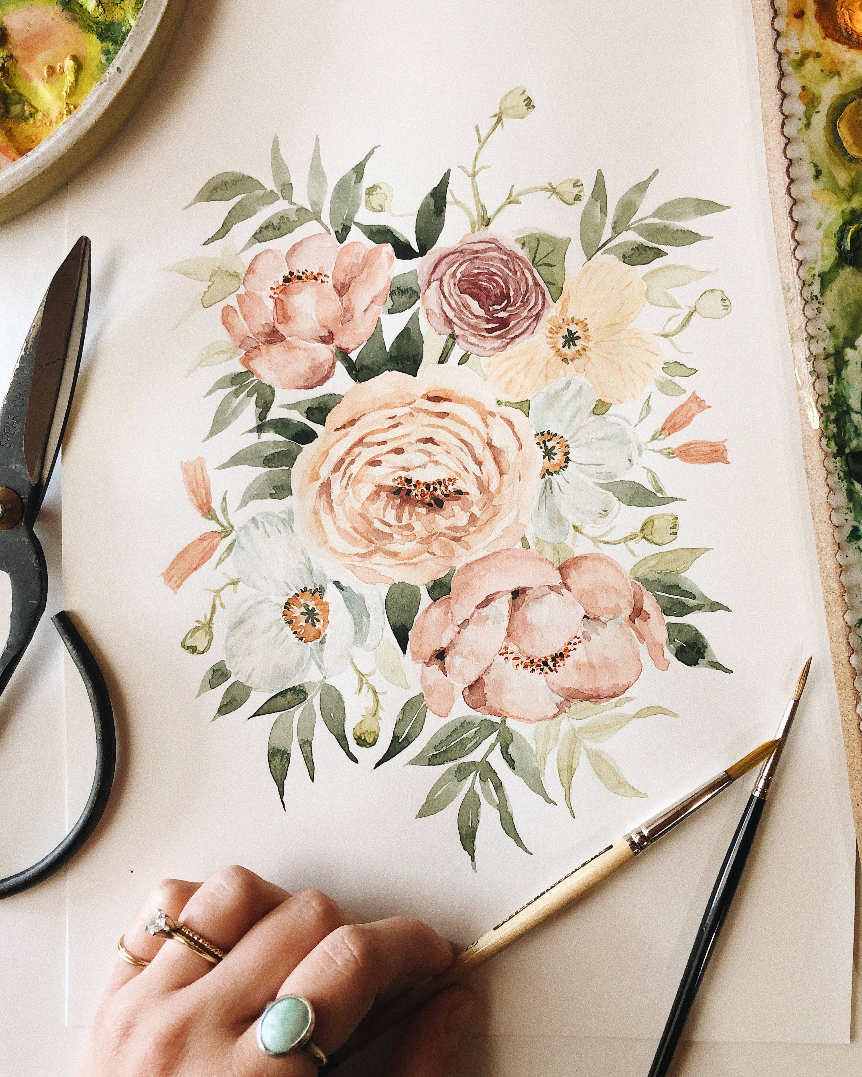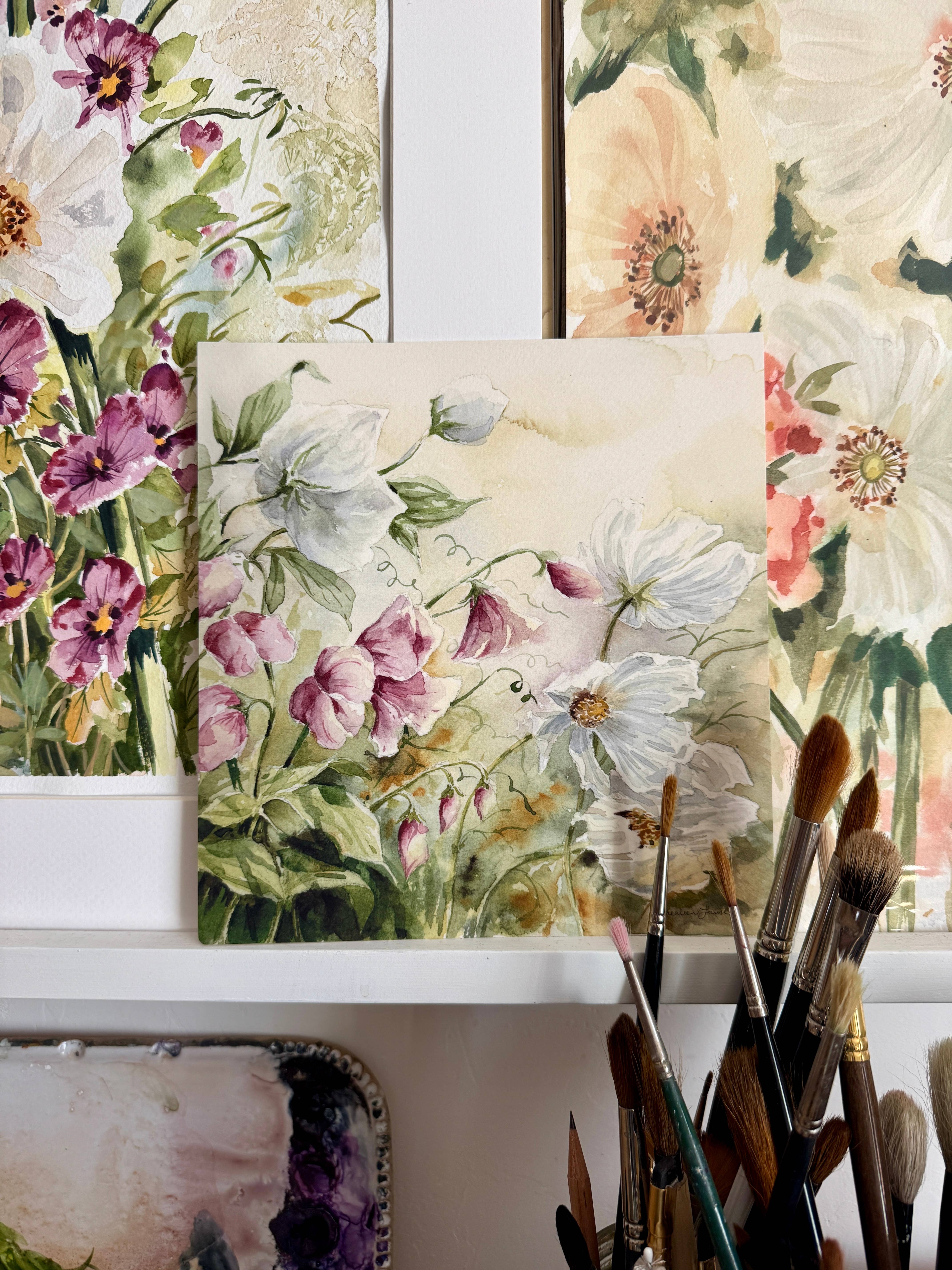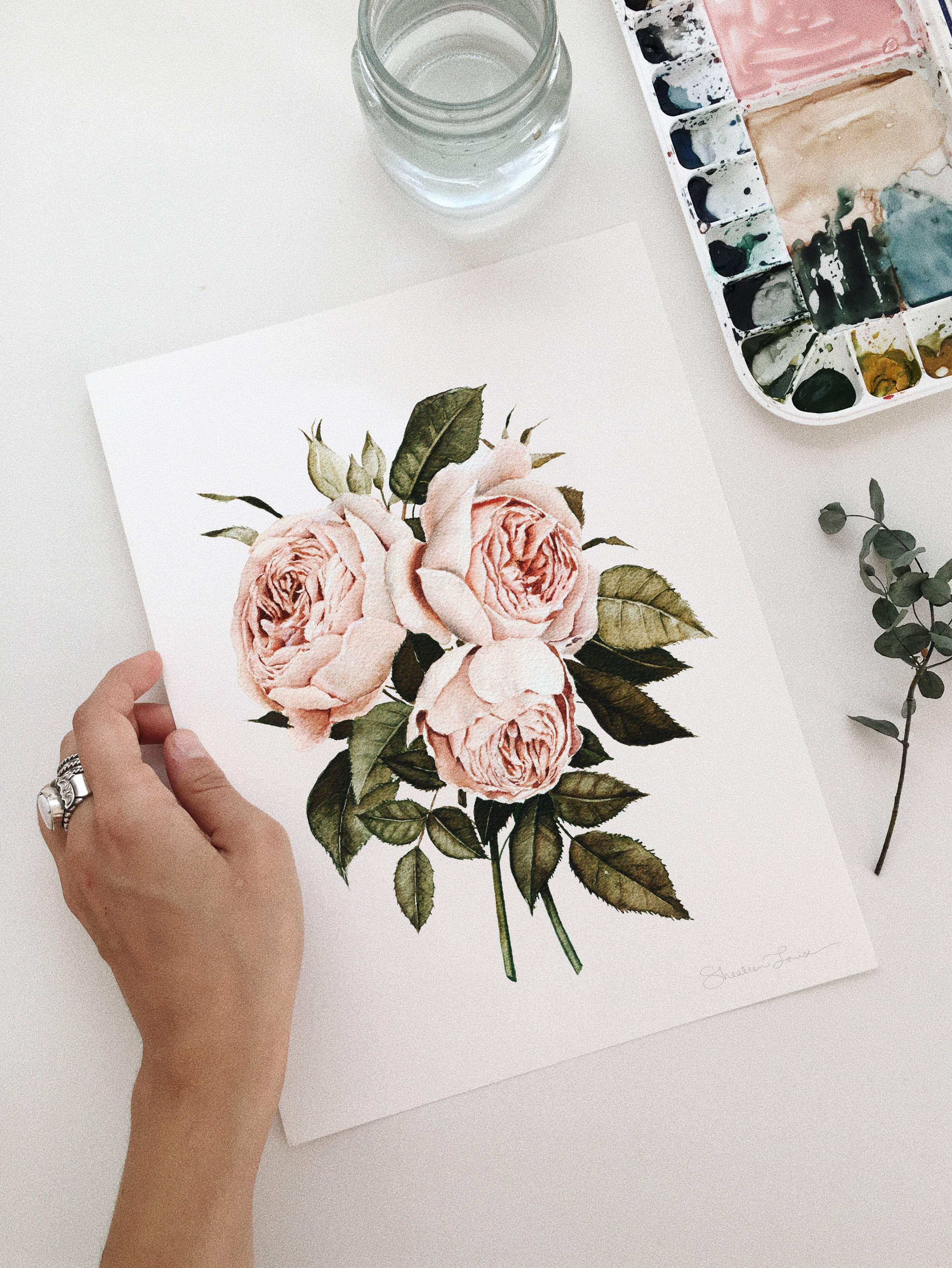 Olá! Sou Shealeen Louise Bishop — uma artista e educadora de aquarela que vive em Corrales, Novo México. Pinto flores detalhadas e expressivas que combinam beleza intemporal com um toque de charme moderno. Como mãe que fica em casa, muitas vezes pinto durante a sesta ou nos momentos tranquilos do dia (que são raros... Mas existem!). Acredito que este ritmo de criação lenta traz um toque intencional e sincero ao meu trabalho. Sou inspirada por flores (claramente), pela beleza do dia a dia e pelos momentos lentos e significativos da vida. A minha esperança é que cada peça traga paz e beleza onde quer que seja exibida.