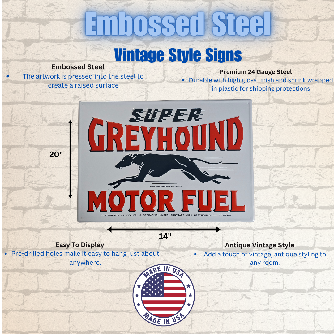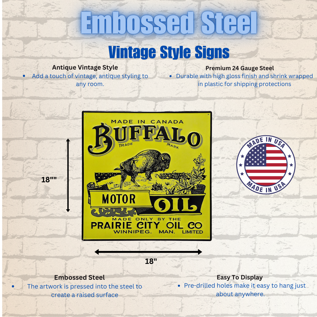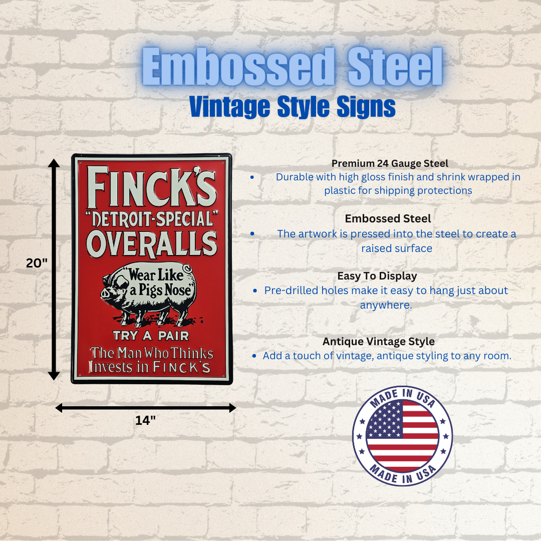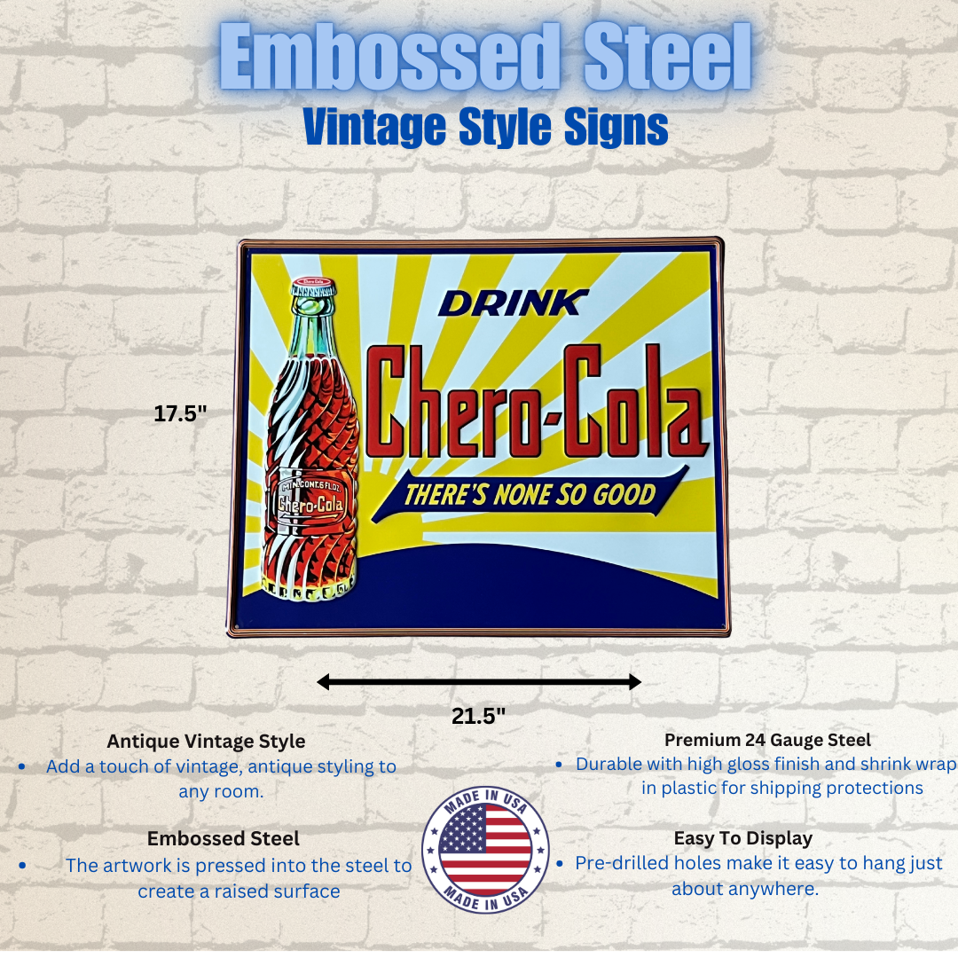 A Vintage Retro Signs Company foi o resultado de um interesse em sinais de publicidade antigos. Como o valor dos sinais autênticos está fora do alcance da maioria das pessoas comuns, decidimos recriar estas belas peças de Americana para que todos possam desfrutar. A maioria dos nossos sinais são reproduções de sinais colecionáveis reais. Fabricados nos EUA usando aço de calibre 24, cada sinal é em relevo e embalado individualmente. Confira a nossa mais recente linha de sinais de aço pesado de calibre 18. Cada um tem um acabamento durável de alto brilho.