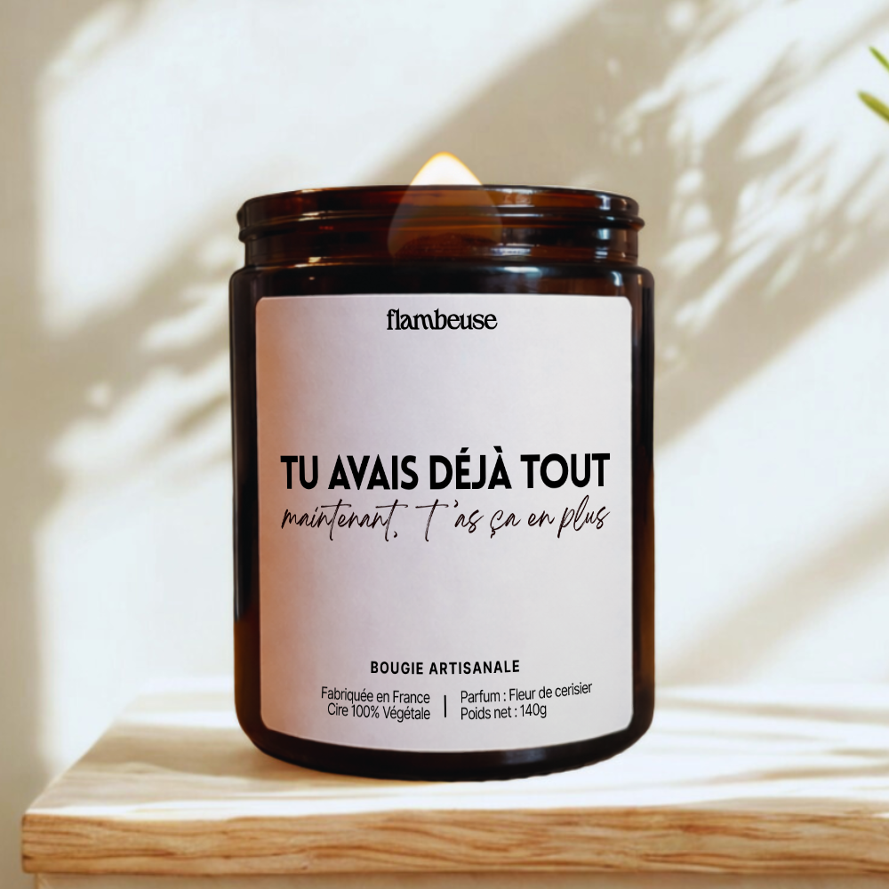 Na Flambeuse, cada vela é uma declaração de intenção. Feitas à mão em França, as nossas criações combinam cera 100% vegetal, pavio de madeira crepitante e perfumes de Grasse cuidadosamente escolhidos. Acreditamos em velas que contam uma história — por vezes engraçada, por vezes suave, sempre sincera. As nossas coleções jogam com as emoções, o humor e as referências culturais, valorizando ao mesmo tempo o savoir-faire artesanal francês e materiais responsáveis. ✨ Feito em França – Perfume de Grasse – Cera vegetal – Pavio de madeira – Feito à mão com humor e amor