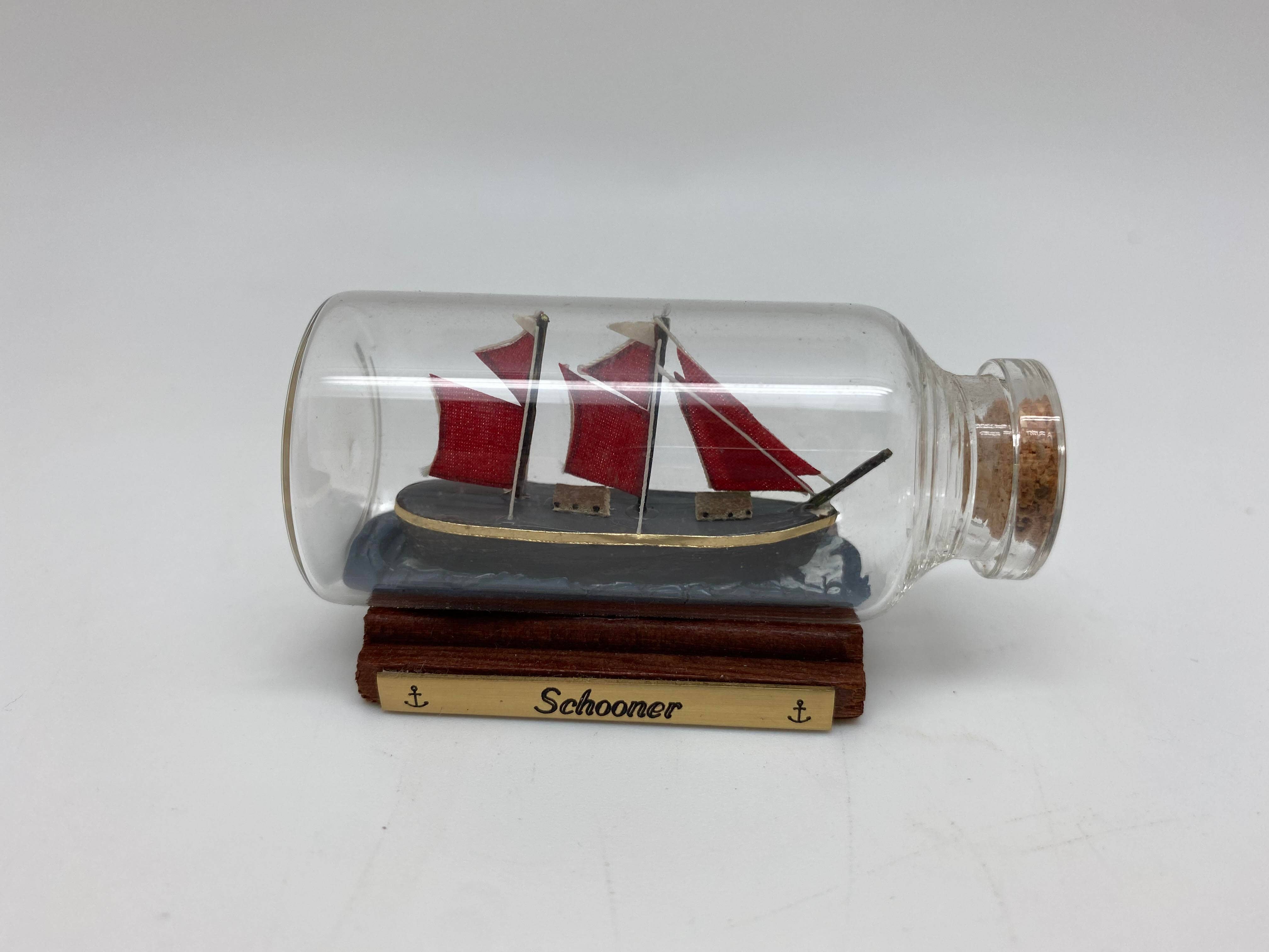 Eu trabalho diretamente com uma família de artesãos no Uruguai que constroem navios em miniatura em garrafas. A primeira argila de modelagem é esculpida na garrafa para se parecer com água. Em seguida, um casco de navio é inserido através do gargalo da garrafa e embutido na argila. Em seguida, cada mastro é cuidadosamente inserido e colado ao casco. Esse processo é repetido até que o navio seja concluído. A garrafa é então colada a uma base de madeira completa com uma placa de latão com o nome do navio. Podemos fazer um navio personalizado para a sua localização, por favor, pergunte para obter detalhes.