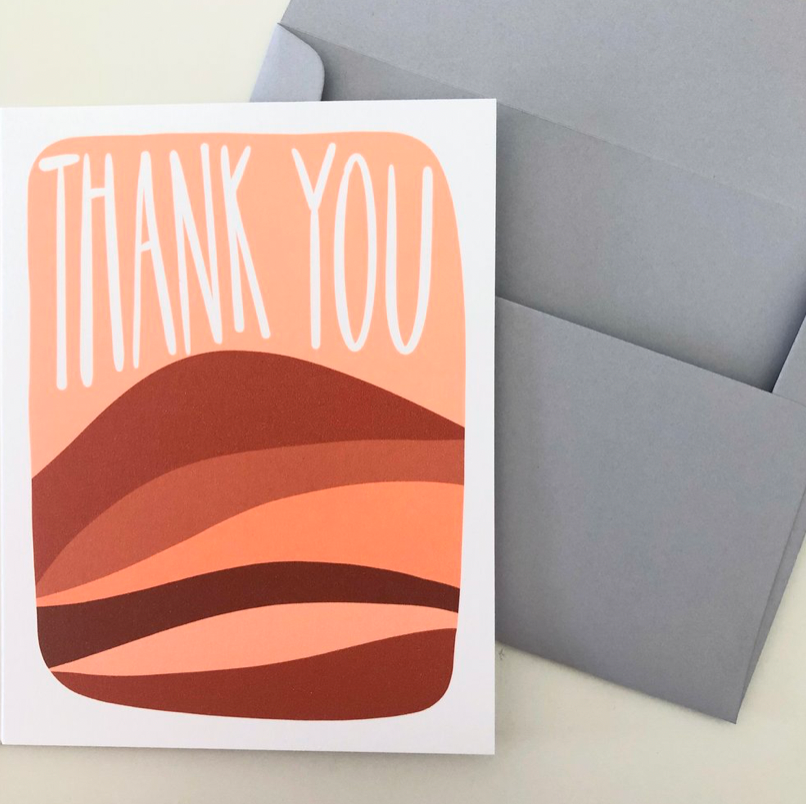 Lá fora: Obrigado, chupas. Dentro: Em branco. Tamanho: 4.25" x 5.5". Papel: branco brilhante, reciclado, pesado. Envelope: reciclado, a condizer. Tinta: Arquivística. Vem em uma manga clara para proteção. Tamanho: A2.
