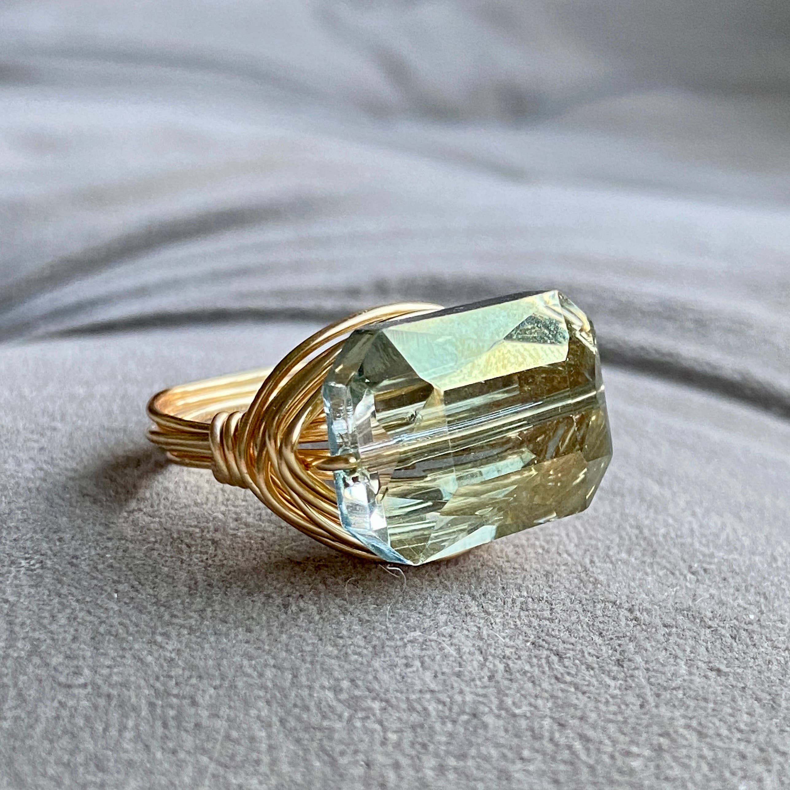 Este brilhador faz uma declaração, facetada para apanhar a luz em todas as direções. Um lindo arame de ouro cristal retângulo envolto. Utiliza um fio resistente a manchas douradas e um cristal púrpura. Este anel é embrulhado e de tamanho personalizado. Opções de tamanho e cor escolhidas no checkout. Também disponível em fio prateado. Eu selo todos os meus metais contra o mancha, mas ainda é importante manter os metais secos, longe da humidade.