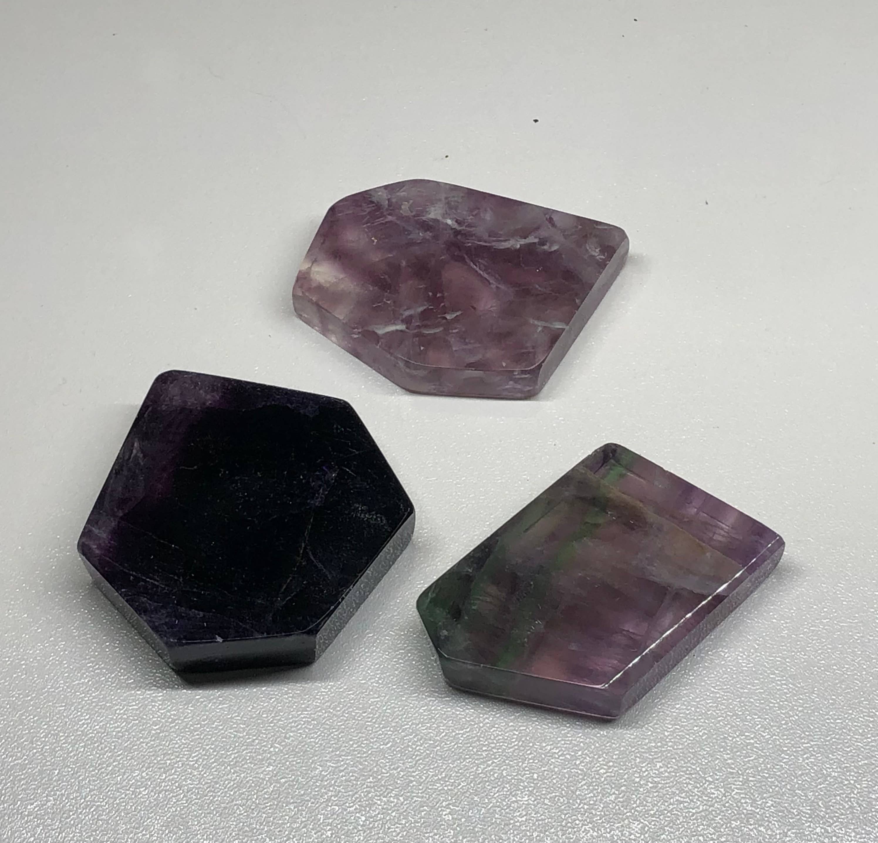 Cortado e polido em todos os lados - as fatias de Fluorite roxo, verde e claro arco-íris são perfeitas para exibir. O fluorito promove o discernimento e a aptidão e diz-se que arrancou ordem no coração do caos. Fornece uma energia estabilizadora, ajudando as relações e os indivíduos a florescerem num reino que é benéfico para ambos.
