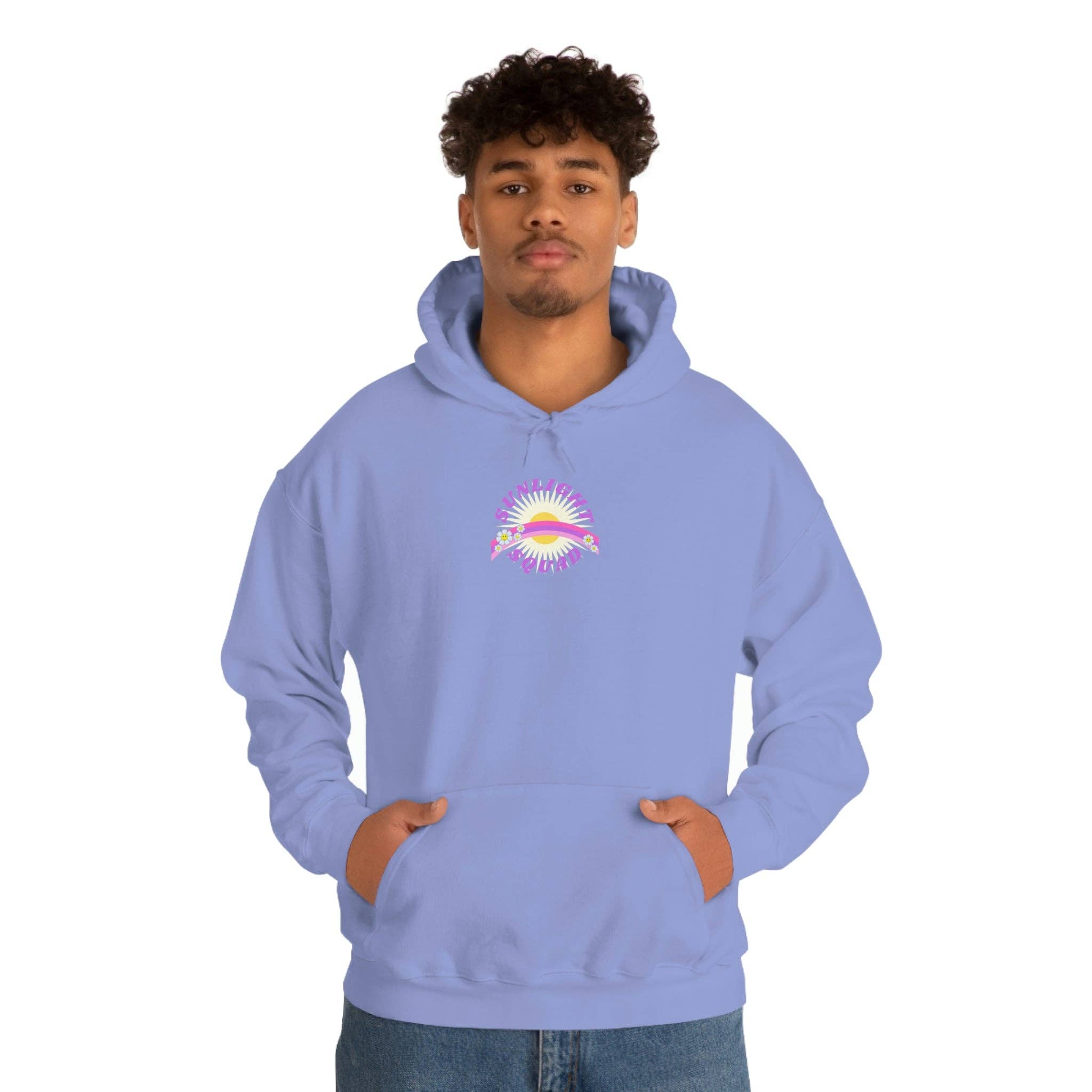 ESPÍRITO FELIZ VIDA FELIZES CAPUZ! Em cores raras de hortelã, safira e orquídea violeta! Uma sweatshirt unisexo com capuz é relaxante. O material é uma mistura espessa de algodão e poliéster. Isto faz com que uma sensação pelúcia e suave ao lado do calor. Não há costuras laterais. Um espaçoso bolso canguru paira em frente. O cordão do capuz tem a mesma cor da camisola base. 50% algodão, 50% poliéster Tecido médio-pesado (8,0 oz/yd² (271 g/m²) Etiqueta de encaixe clássico Corre ao tamanho