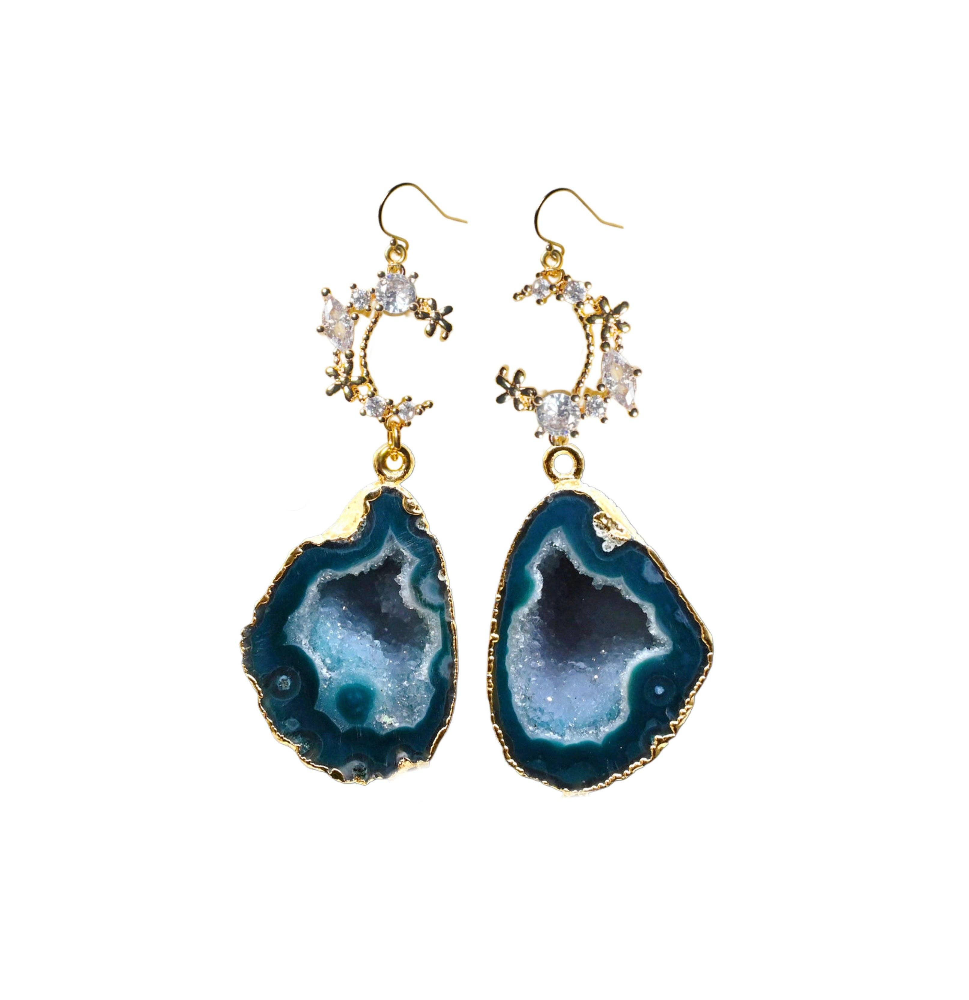 Estes brincos de geodo em cor de vinho encarnam calor, profundidade e sofisticação sem esforço. Os tons ricos de vinho e a textura natural do cristal criam um visual que parece tanto terroso quanto elegante. Emoldurados em ouro, captam a luz de forma magnífica e adicionam um toque de glamour boémio a qualquer conjunto. 6,35 cm de comprimento Ganchos de brinco preenchidos a ouro de 14k