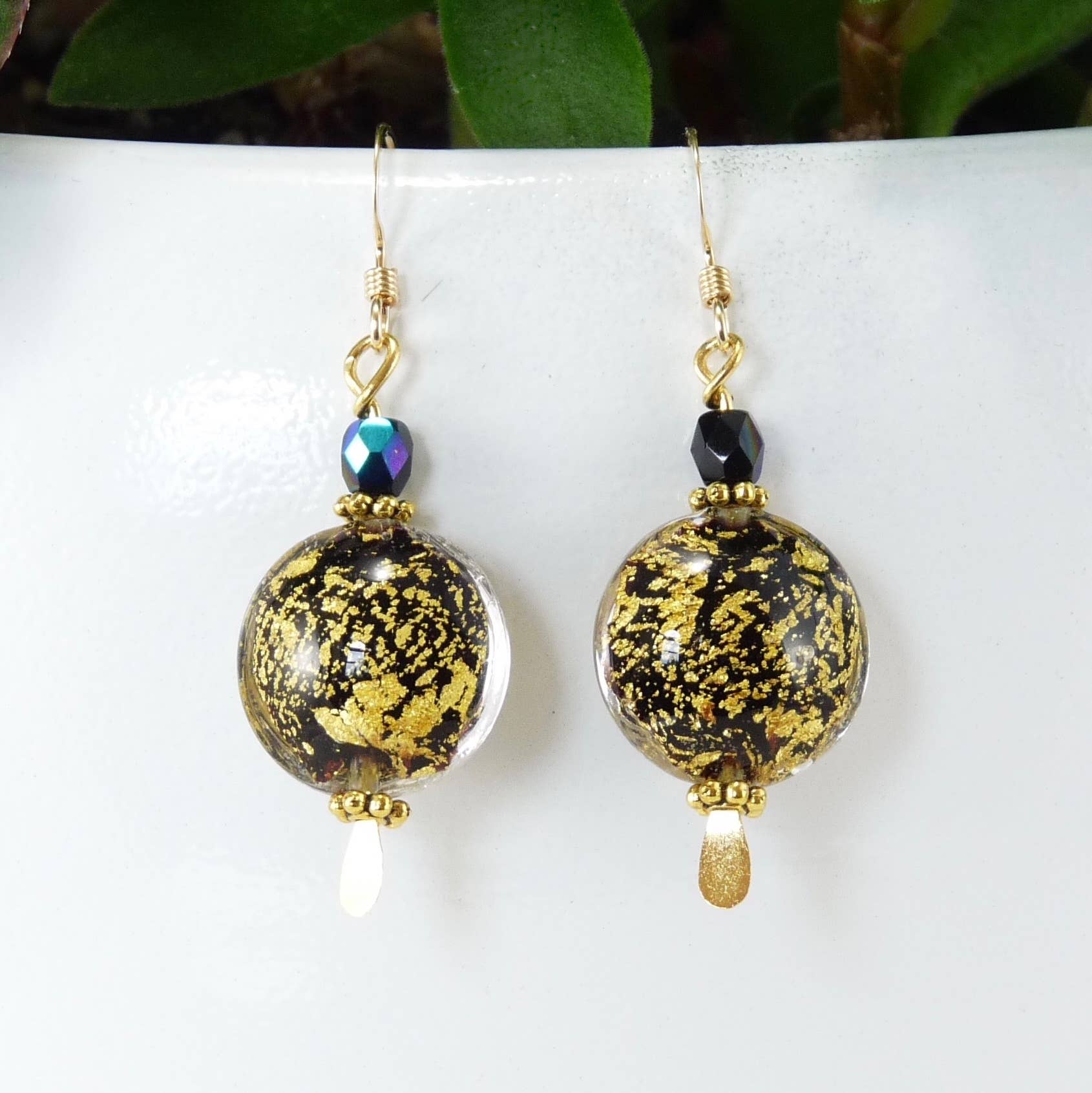 Cada conta destes colares de 48 cm (19") é feita manualmente com nó em um cordão forte de náilon. As contas centrais brilhantes de Murano são confeccionadas com folha de ouro 24 kt ou prata esterlina, envoltas em vidro italiano. As tonalidades das contas podem variar levemente devido ao vidro usado, à temperatura e à época do ano em que são feitas, tornando cada uma única. São realçadas com vidro tcheco e cristais austríacos. Combinam com os brincos Murano #916, colares Murano #516 e pulseiras Murano #116. As cores disponíveis estão indicadas da esquerda para a direita na foto principal. Todas as contas vêm de Veneza, Itália, sendo facilmente reconhecidas por clientes que viajam para a Itália.