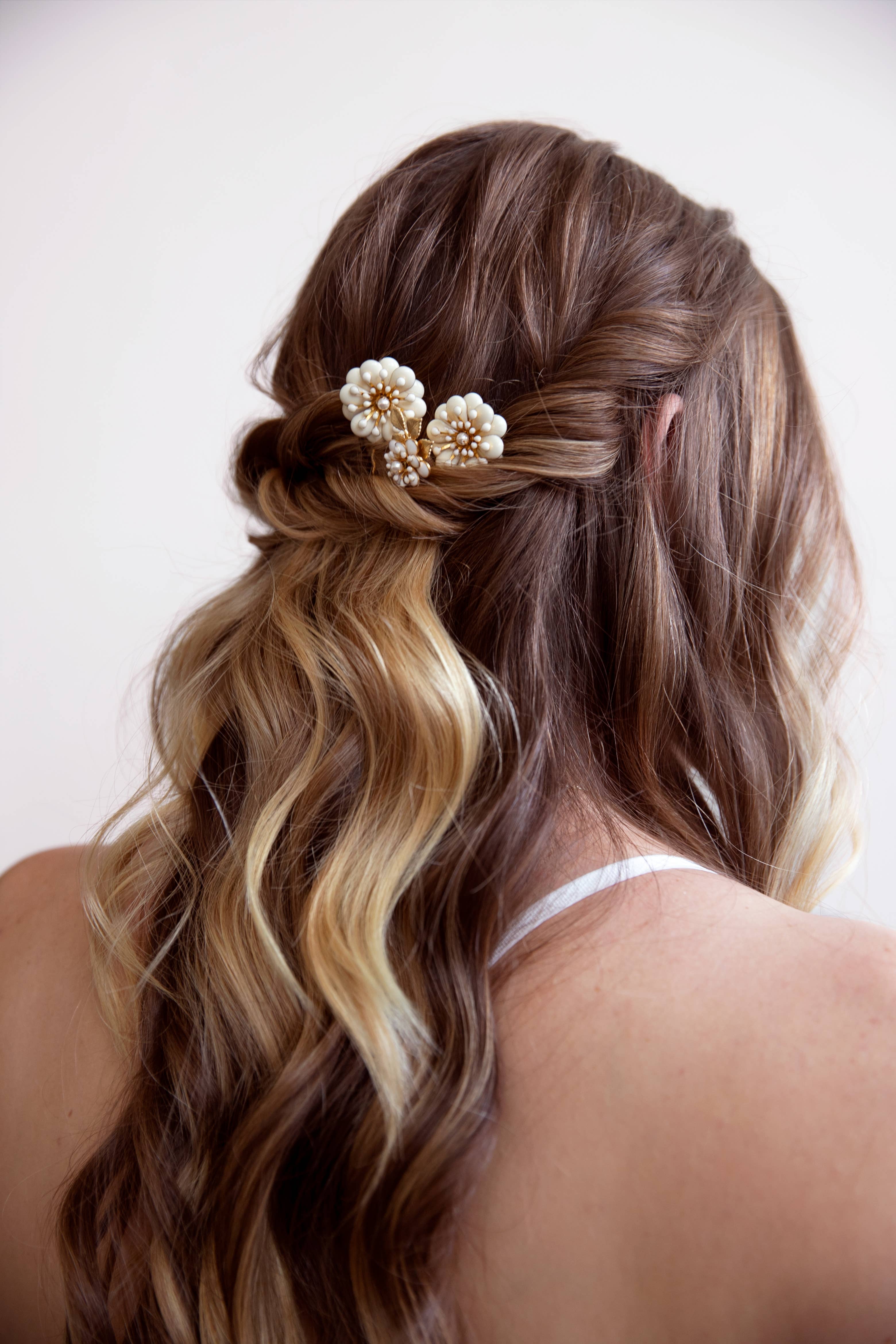 Belas flores esmaltadas em branco e dourado adornam uma fita metálica dourada. Leve e fácil de usar. Feito à mão no nosso estúdio do Sul da Califórnia