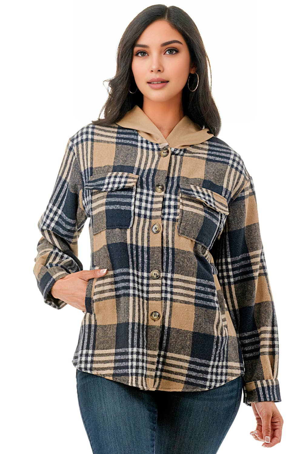 Casaco de flanela xadrez de tamanho grande com capuz e bolsos