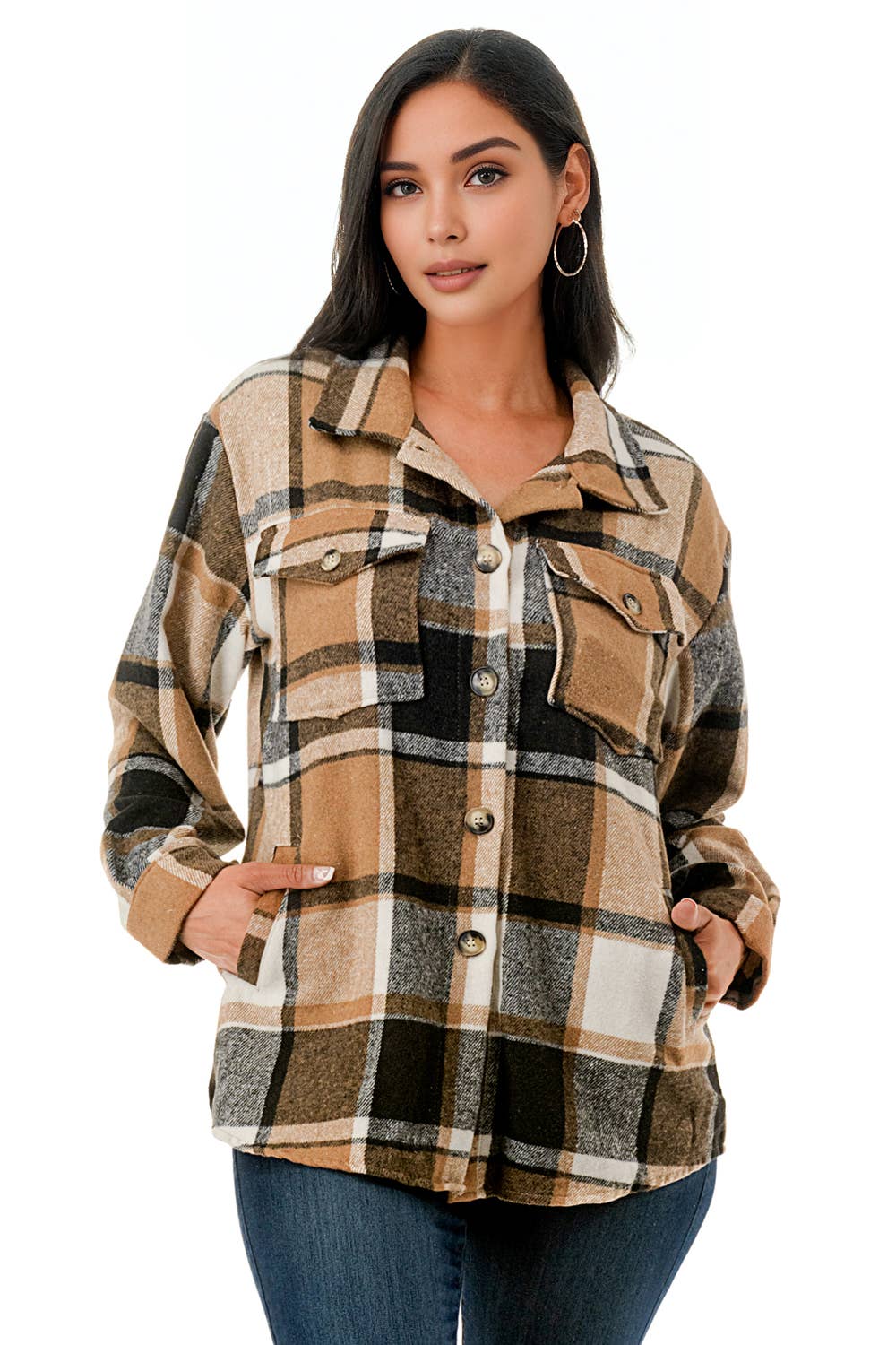 Cabana de flanela xadrez. Tecido xadrez xadrez mais grosso. Excesso de tamanho. Bolsos laterais. Costas com capuz de cor sólida. Bolsos frontais superiores. Casaco de camisa de manga comprida com botões. 100% poliéster. Importação. A embalagem interna vem S/M/L/XL (1:2:2:1) 6 unidades/pacote.