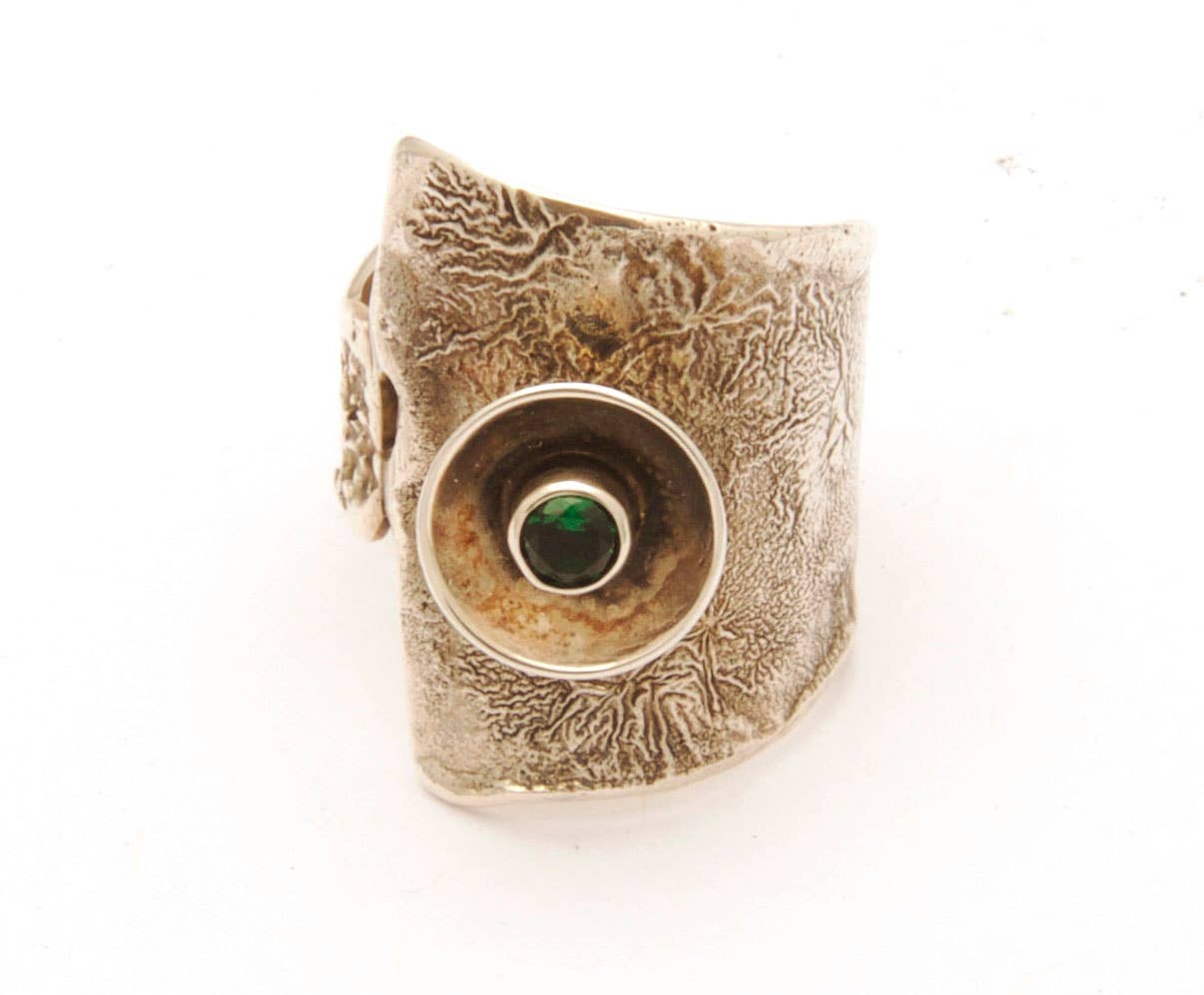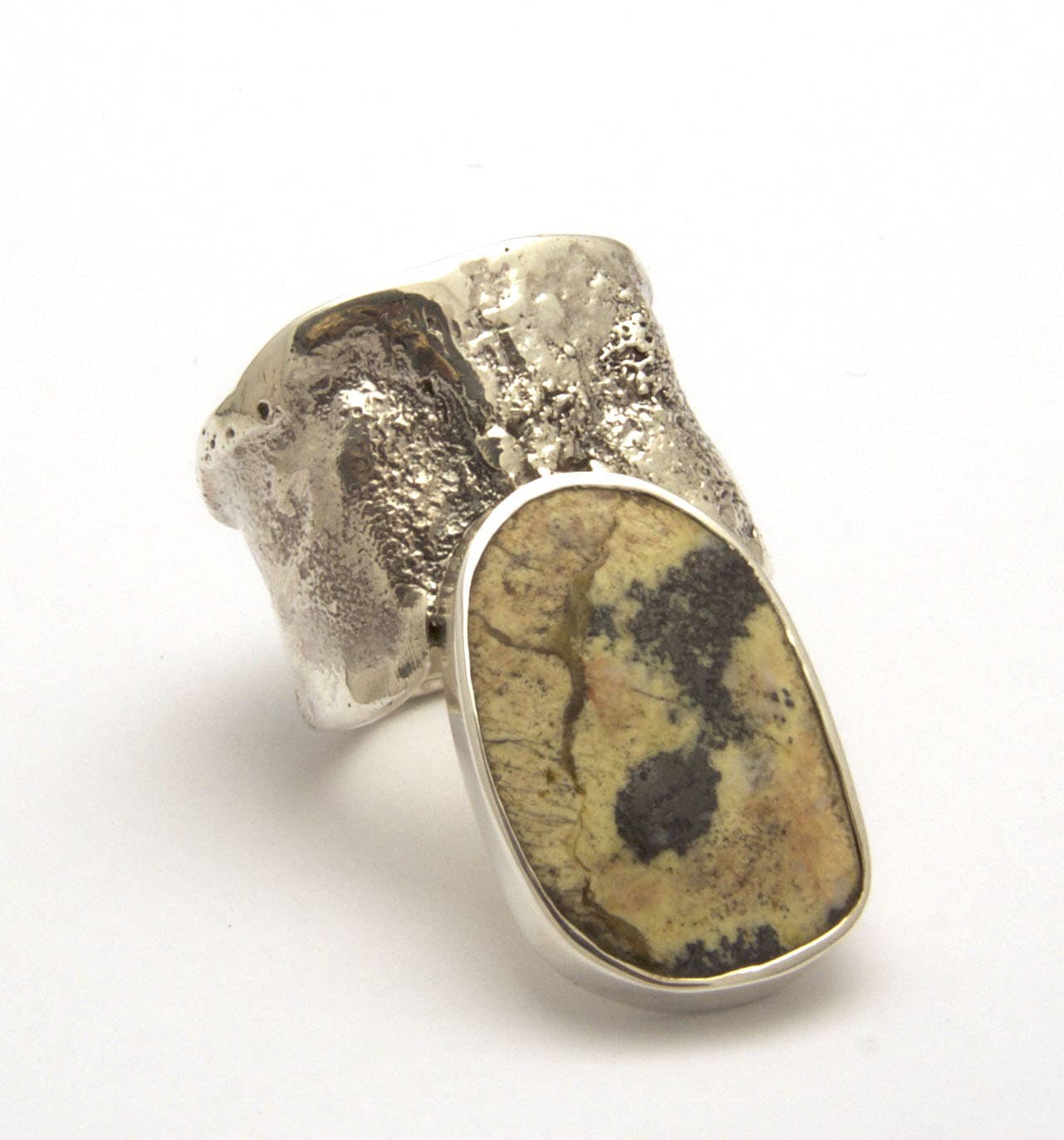 Punho fundido reticulado em prata esterlina com detalhes em bronze e pedra oval de labradorita, a largura total com pedra é de 2 polegadas.