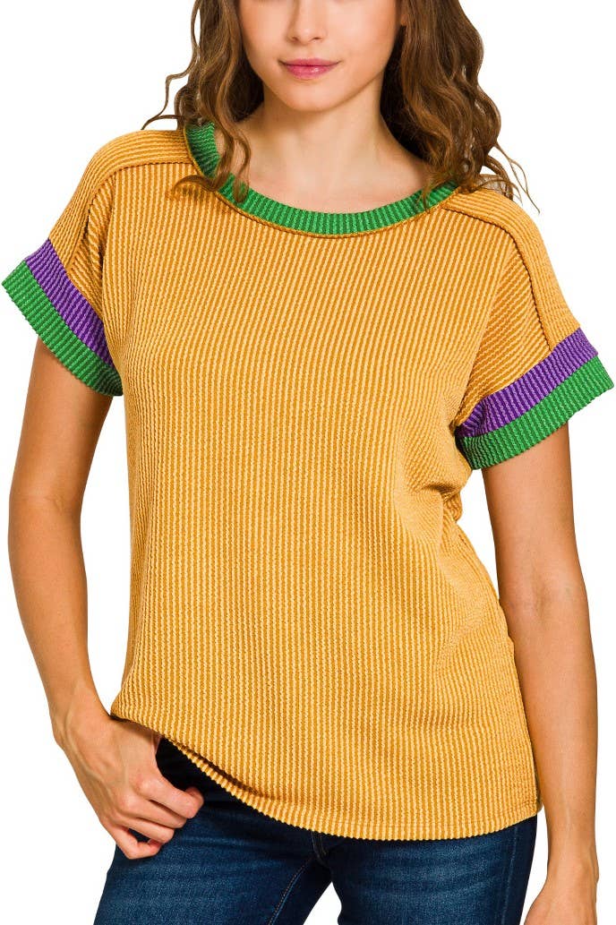 Top Vintage Lavado Fleur Mardi Gras Top de Mardi Gras com Patches de Lantejoulas Fleur De Lis Lavado Vintage e Franjas nas Costas, Manga Curta Dolman Mardi Gras Feito na China