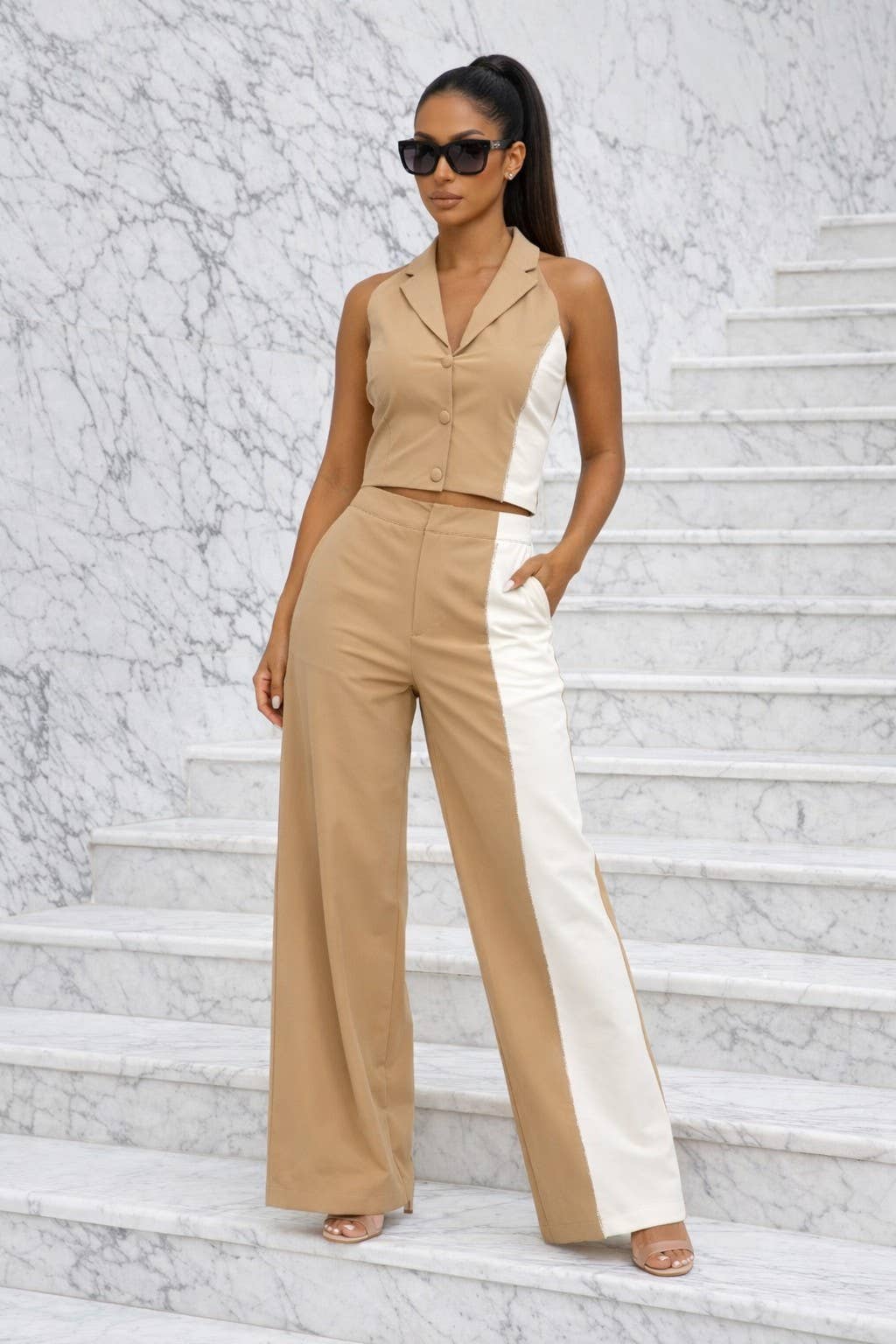 Este é um conjunto de calças bonito e sofisticado.