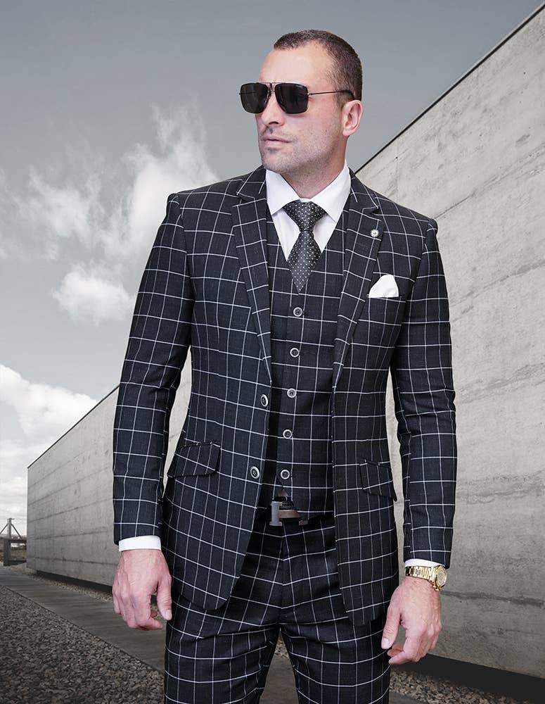 Conjunto de terno xadrez 3 peças feito de lã italiana super 200's com cashmere. Calça de corte moderno com frente lisa.