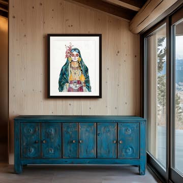 Edição limitada de impressão giclée pelo artista de Denver, Dolan Geiman. Mulher do Dia dos Mortos/Dia de los Muertos com uma jaqueta de cavalo. Cada impressão é uma reprodução detalhada de uma colagem de papel impressa em papel artístico mate, assinada e numerada. Cada colagem de papel foi construída a partir de materiais reciclados. *Tamanhos: 24 x 30 || 32 x 40 *Embalagem: impressões pequenas sem moldura são embaladas em uma manga plástica selada com suporte de espuma || impressões médias e grandes sem moldura são enviadas enroladas dentro de seu próprio tubo de kraft individual com tampa rotulada (ver fotos). *Suportes: procure o produto Print Hanger | Magnético | Nogueira para detalhes do produto de suporte de nogueira. *Envio: Impressões sem moldura são enviadas em 1-3 dias. Decoração de parede para casa mexicana do sudoeste com tema de cowgirl do Dia de los Muertos. Sudoeste