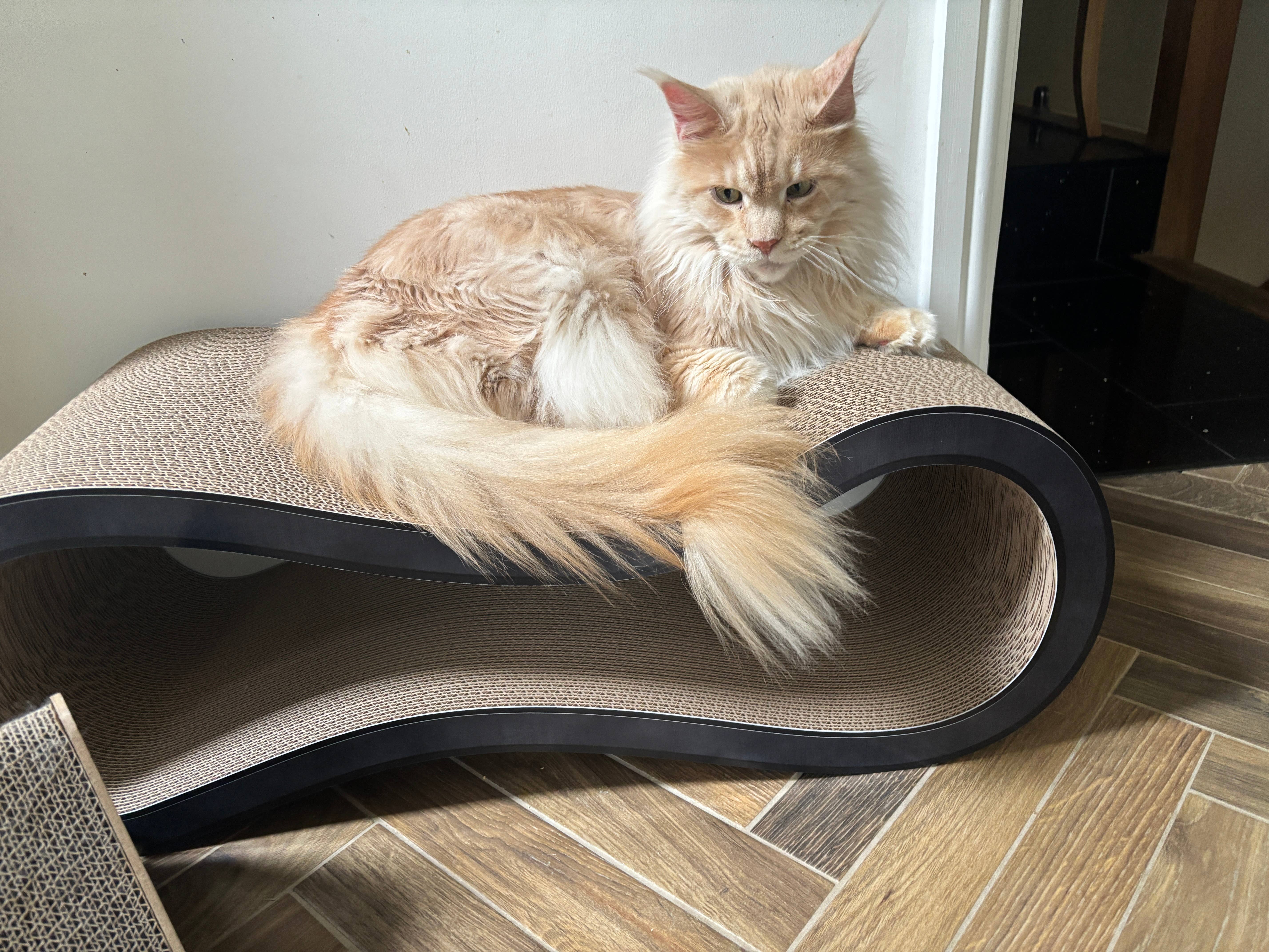O móvel para gatos SINGHA L Design da cat-on é um espaço multifuncional para descanso, feito de papelão ondulado robusto e durável. Serve como arranhador, cama e playground para gatos simultaneamente. Este móvel para arranhar possui outra vantagem: sua construção extremamente resistente com papelão ondulado de alta robustez oferece uma superfície de arranhadura duradoura, facilitando cuidados com as garras. Atende a todos os requisitos de um bom móvel para arranhar: robustez, estabilidade, durabilidade, ergonomia e multifuncionalidade. Nosso móvel para gatos se destaca em qualidade de papel e acabamento em comparação a produtos similares. Apesar do custo maior de aquisição, quase todos os clientes permanecem fiéis à marca devido à excelente durabilidade. Com nosso serviço de personalização, você pode aproveitar a fidelidade do cliente com seu logo ou co-branding, fortalecendo o vínculo com seu negócio. Cada pedido é feito individualmente!