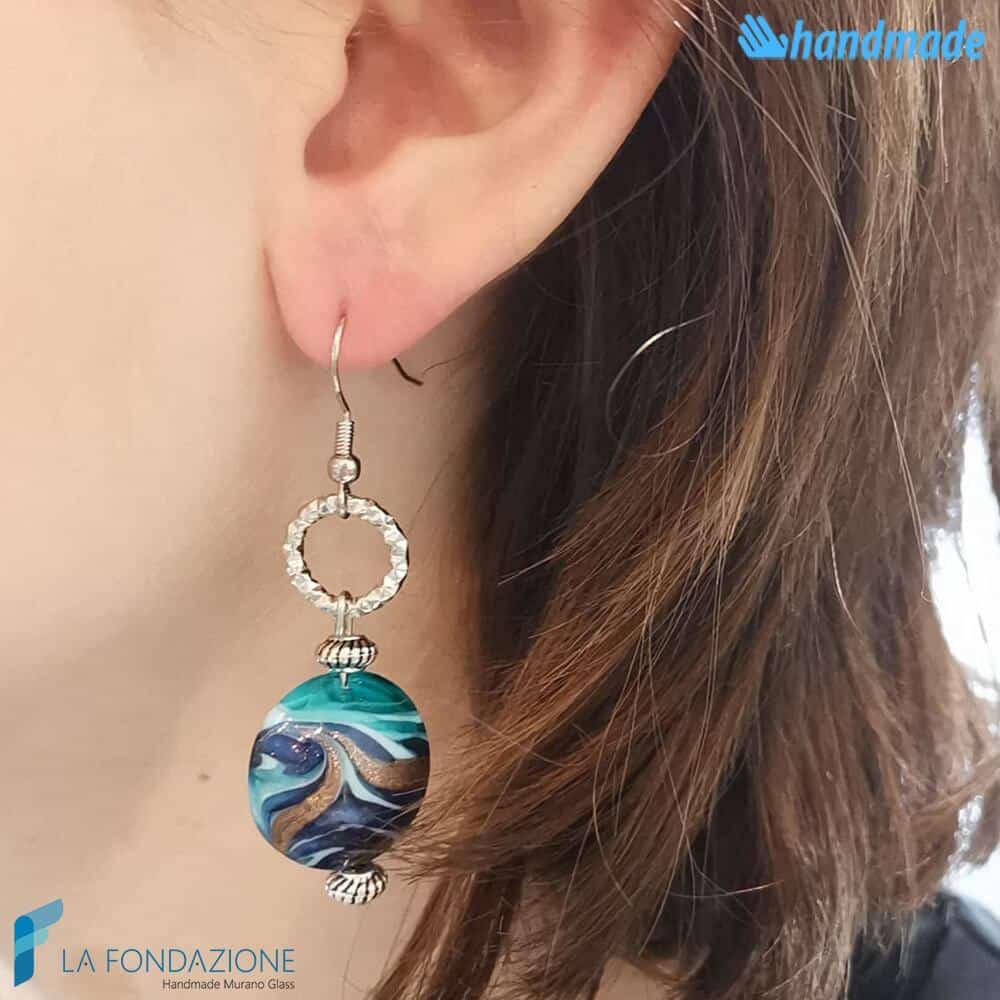 <strong>Brincos pendentes</strong> feitos com vidro <strong>Murano autêntico</strong> e folha de <strong>prata</strong>, no formato de disco com cor azul intensa e desenho de olho em <strong>aventurina</strong> e <strong>calcedônia</strong> que conferem uma coloração única. Disponíveis com gancho clássico aberto ou fechado, sempre em metal hipoalergênico.